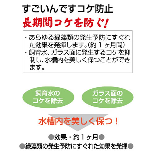 原材料高級脂肪酸化合物、各種化合物対象淡水専用原産国日本使用方法ご使用前には必ずよく振ってから、所定量を水槽内に直接注いでください。ご注意本品は観賞魚用品です。他の用途にはご使用にならないでください。古代魚(アロワナ等)や甲殻類(エビ等)の飼育には使用しないでください。・あらゆる緑藻類の発生予防にすぐれた効果を発揮します。(約1ヶ月)・飼育水、ガラス面に発生するコケを抑制し、水槽内を美しく保つことができます。・本品を使用してpH値や硬度が大きく変化することはありません。