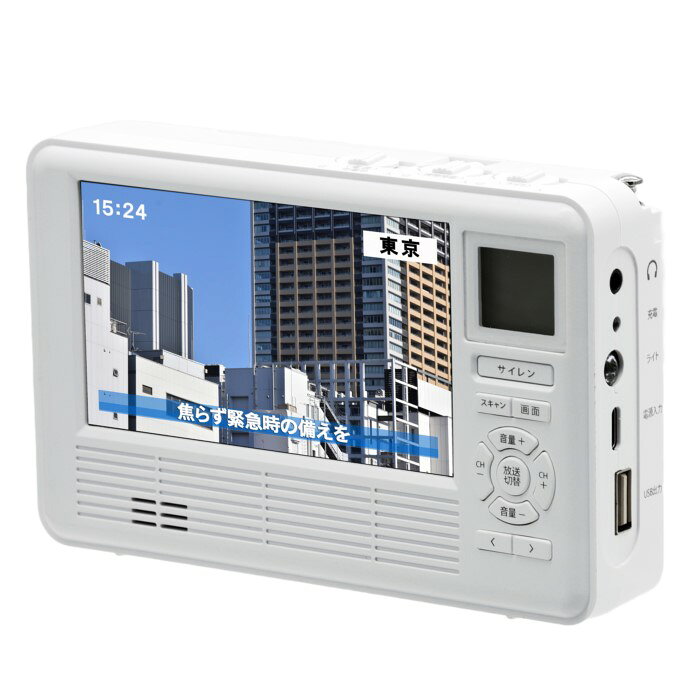 ■製品仕様(TLM-ETR017) カラー:ホワイト、ブラック サイズ(約):幅14.6×高さ9.2×奥行3.2cm 重量(約):300g(本体のみ) 電源: 本体 / 入力DC 5V ACアダプター / 入力AC 100V、出力DC 5V 乾電池 / 単4形アルカリ乾電池4本 内蔵電池 / リチウムポリマー電池 3.7V 2000mAh スピーカー:2W×1 端子: イヤホン用3.5mmステレオ端子 携帯充電用USB出力端子(Type-A) 本体電源用USB入力端子(Type-C) ディスプレイ: メイン / 4.3インチ TFT液晶パネル サブ / TN LCD(17.5×19.2mm) 受信周波数: ワンセグテレビ / 470〜770MHz FMラジオ / 76〜108MHz AMラジオ / 522〜1710kHz 短波ラジオ / 3.9〜21.85MHz(10区分) アンテナ: ロッドアンテナ(ワンセグTV・FMラジオ・短波ラジオ) 内蔵フェライトバーアンテナ(AMラジオ) サイレン:80〜90db LEDライト:輝度(ルーメン数)/40〜50 動作環境:動作時/0〜40度、保管時/−10〜50度 充電時間(AC給電):約3時間(充電環境によって異なります) 保証:1年間 付属品:ACアダプター、USBケーブル、イヤホン、簡単ガイド、取扱説明書(保証書付き) 生産国:中国 ■使用時間の目安 内蔵バッテリー(満充電時): ワンセグTV / 約8時間、約15時間(音声のみ) FMラジオ / 約20時間 AMラジオ / 約20時間 短波ラジオ / 約20時間 LEDライト / 約24時間 サイレン / 約3時間 アルカリ乾電池 ワンセグTV / 約4時間、約10時間(音声のみ) FMラジオ / 約15時間 AMラジオ / 約15時間 短波ラジオ / 約15時間 LEDライト / 約20時間 サイレン / 約2.5時間 手回し充電(1分間に120回転を10分間回した場合) ワンセグTV / 約5分、約15分(音声のみ) FMラジオ / 約30分 AMラジオ / 約30分 短波ラジオ / 約30分 LEDライト / 約30分 サイレン / 約20分 【注意事項】 ・ 各種放送は、一部地域や環境施設により電波が入らない場合がありますのでご了承ください。 ・ データ放送、緊急警告放送(EWS)には対応しておりません。 ・ 本製品に付属のUSBケーブル端子と異なる規格の場合、携帯電話機器への充電は別途専用USBケーブルをご用意ください。 ・ 一部の携帯電話やスマートフォンは充電できない場合がございます。 ・ 乾電池では携帯電話の充電はできません。 ・ 充電式乾電池は充電できません。 ・ 写真はハメコミ合成です。 ・ 本製品の仕様および外観は、製品性能の改良などのために変更する場合がありますのでご了承ください。テレビ画面が大きくなった「エコラジネオ」が誕生! エコラジシリーズ「エコラジ7」の後継商品です。 「普段から使っていれば緊急時でも迷わない」をコンセプトにしたエコラジシリーズは、 テレビやラジオなど「日常」でも「緊急時」でも役立つ商品としてご使用いただけます。 ●主な改良ポイント 【 液晶画面がサイズアップ 】 3.5インチから4.3インチにサイズアップ。画面が約1.3倍になり、より見やすくなりました。 【 ラジオのノイズを軽減 】 デュアル液晶を採用してノイズの干渉を抑えることに成功。ラジオの受信感度が約16%アップして、ノイズの少ないクリアな音声が楽しめます。 【 ワンセグTVに設定機能を追加 】 受信したチャンネルの番組表を表示可能 字幕のオン・オフ切り替え 主音声・副音声・主+副音声の切り替え ●主な機能 ワンセグTV、FMラジオ、AMラジオ、短波ラジオ、緊急サイレン、LEDライト、携帯充電、手回し充電 ●様々な状況に対応できる3way電源+α ・AC電源→ご自宅で ・内蔵バッテリー→ちょっとした外出に ・単四乾電池×4本→外出先で内蔵バッテリーが無くなった時に ・手回し充電→電源が確保できない緊急時に!