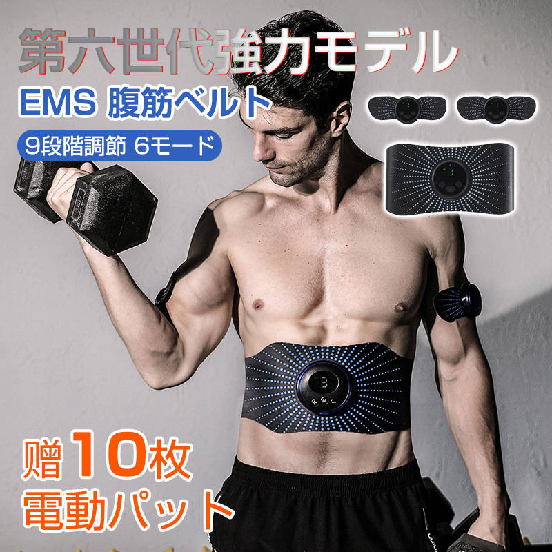 お買い物マラソン【P5倍】【第六世代 強力モデル】EMS 腹筋ベルト 筋トレ 腹筋パッド 消耗ジェルシート不要 延長ベルト追加 筋肉刺激 電池式 9段階調節 6モード 10枚電動パット プレゼント 強力 トレーニング 振動 腹筋マシン ジェルパッド ブラック
