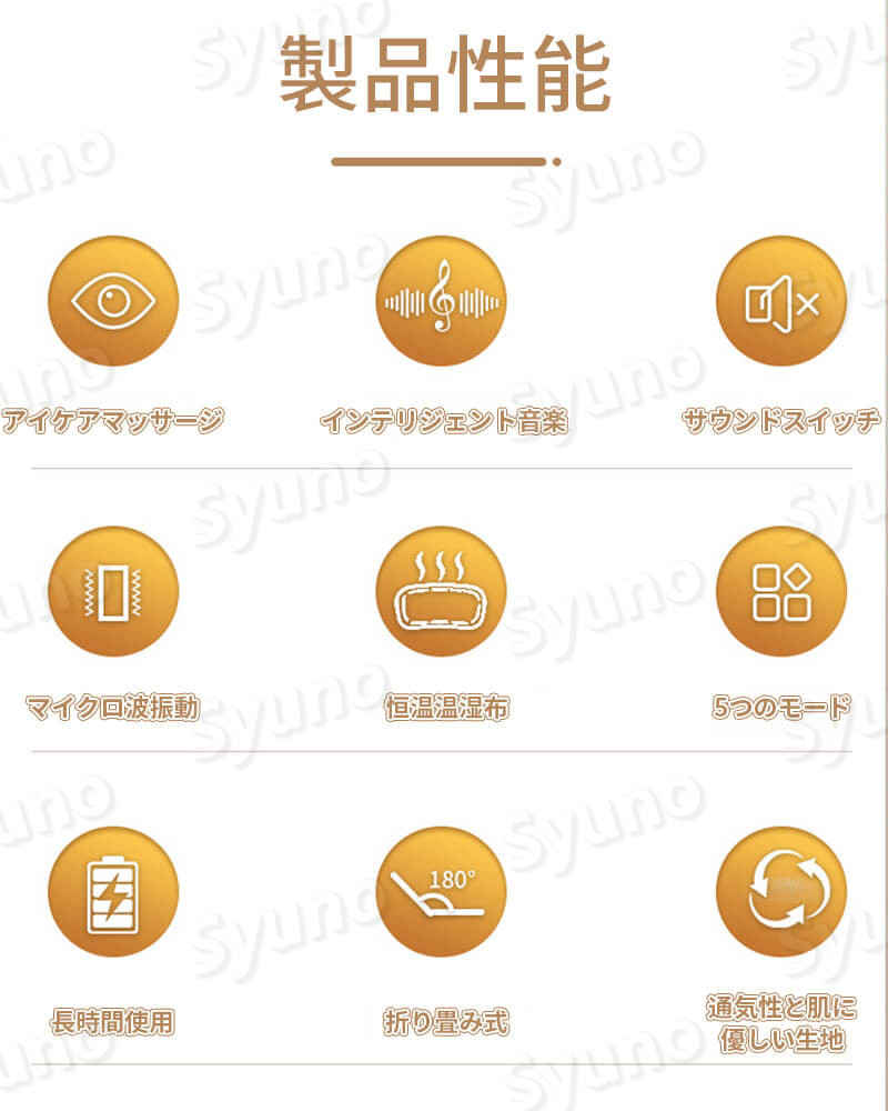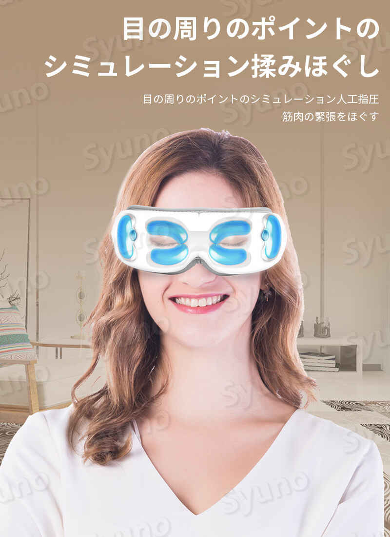 製品パラメータ *本品は手動測定ので多少の誤差がありますが実際の製品をご参照ください 名称:目マッサージャー 色:白色 サイズ:23*16*9cm 素材:ABS環境に優しい素材、プロテインレザー素材 リスト:取扱説明書(英語)/本体/電源コード 充電時間:2.5h 製造国:中国 5つのアイケアモード 1.総合モード:インテリジェントアイケア、リラックス効果(空気圧+振動+温湿布+音楽) クリアモード:目元を改善し、目を明るくする(空気圧+振動+温湿布+音楽) 3.睡眠モード:明け方まで心地よい寝心地(空気圧) 4.バイタリティモード:目元を活性化させる(振動+音楽) 5.コンフォートモード:疲労解消、リラックスする(温湿布+音楽) ご注意: 該当商品には技適マークが貼付されていなくて 日本国内で使用すると電波法違反になるおそれがあり、予めご了承ください。