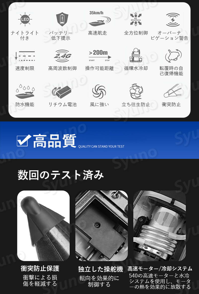 関連キーワード(本商品の説明ではありません):子供プレゼントに最適! リモコン 水上バイク ラジコン 船 ボート 高速 ラジコンボート 高速リモコンボート こども向け リモコン 電動水上おもちゃ RCスピードボート おもちゃ 2.4Ghz無線操作 贈り物 クリスマスプレゼント 初心者「子供の日」最適 電子玩具・キッズ家電 ラジコンカー リモコンカー 水陸両用スタントカー 4WD RCカー 2.4Ghz無線操作 6CH 高速 四輪駆動 360度回転 両面走行特技 USB充電式 耐衝撃 子供向け 車おもちゃ 贈り物 1200mAhバッテリー2個付き 90分間以上航続 陸空両用 小型 ミニ こども向け ラジコン 車 おもちゃ 室内 子供用 プレゼント 男の子 女の子 誕生日 クリスマス おもちゃ USB充電式 ストレス解消 室内遊び 屋外遊び アウトドア パーティー ラジコン 商品仕様 名称:高速ラジコンボート カラー:レッド/ブラック/グリーン 適用:14歳以上 材質:ABS/電子部品 操作可能距離:約200M? 連続使用時間:約17分間 電池:7.4V 3000mAh 航行速度:35km/h リモコン電池:単3電池*4(含まず) 商品サイズ:47*12*13.5cm 産地:中国 機能:前進・後進/左回転・右旋回/転覆時の自己復帰機能/バッテリー低下提示/オーバーナビゲーション警告/水を離れるときは自動的にOFF/転覆防止/ライト付き(ON/OFF可能) パッケージ内容:本体*1、リモコン*1、 レンチ*1、リチウム電池*1、船首保護カバー*1、プロペラ*1、ロックナット*1 スタンド*1、usb充電ケーブル*1、英語取扱説明書*1 ご注意: 該当商品には技適マークが貼付されていなくて 日本国内で使用すると電波法違反になるおそれがあり、予めご了承ください。