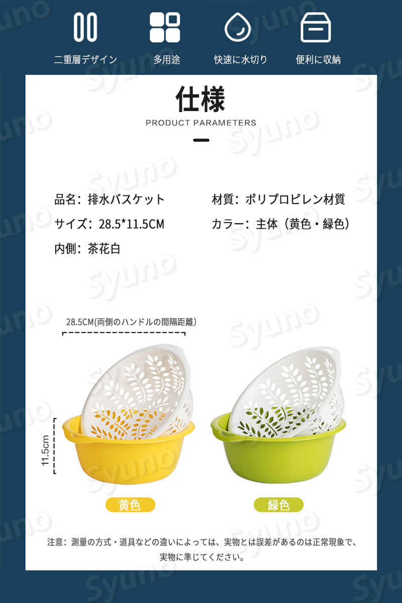 商品情報 品名:排水バスケット 材質:ポリプロピレン材質 サイズ:28.5*11.5CM カラー:主体(黄色・緑色) 内側:茶花白 28.5cm(両側のハンドルの間隔距離) 産地:中国