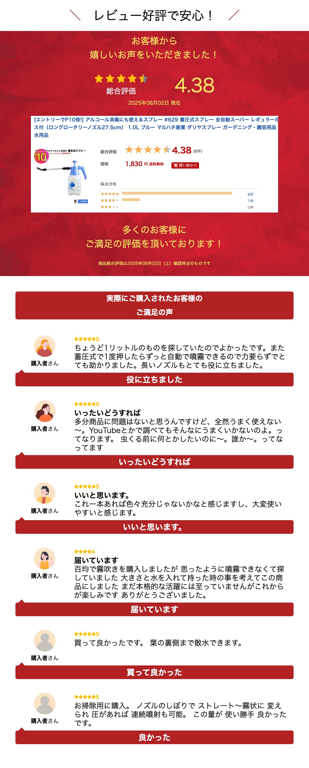 全自動でラクラク噴霧。【商品特長】■レバーをロックすればレバーを押さなくても楽に連続噴霧できます。■ノズルを回すと霧の広がりが自由に調節できます。■強化プラスチックを使用しておりますので耐久性に優れています。■半透明ボトルと目盛付きで残量が一目瞭然。■ロングノズルで遠い所にも簡単散布できます。【用途】■ロングノズルで茂みの中や葉裏にも噴霧しやすい。■庭木や植物の病・害虫の消毒剤や除草剤などに最適。■田畑の・液体の肥料や薬剤の散布などにも最適。■殺虫・殺菌を目的とした薬剤散布に。■お庭のお手入れやガーデニングでの水やりなどに。■アルコール消毒(無水エタノールは80%以下に薄めたもの)にも使えます。【商品仕様】■容量:1.0L■寸法:W420 × D105 × H275 mm■ノズルの長さ:27.5cm(ファイバーグラス)【材質】■本体:ポリプロプレン■容器:ポリエチレン■ロングロータリーノズル:グラスファイバー、ポリプロピレン【備考】※中国製※本体からタンクを取り外して、液体を8分目程度入れてポンプを10〜15回くらい圧縮してからレバーを押してください。※ノズルが詰まったときは外して水洗いしてください。※強酸性、溶解性、揮発性、粘質のある液体またはお湯は使用しないでください。※ポンプの押し具合が重くなった時は、ポンプの先のパッキンにミシン油などをつけてください。