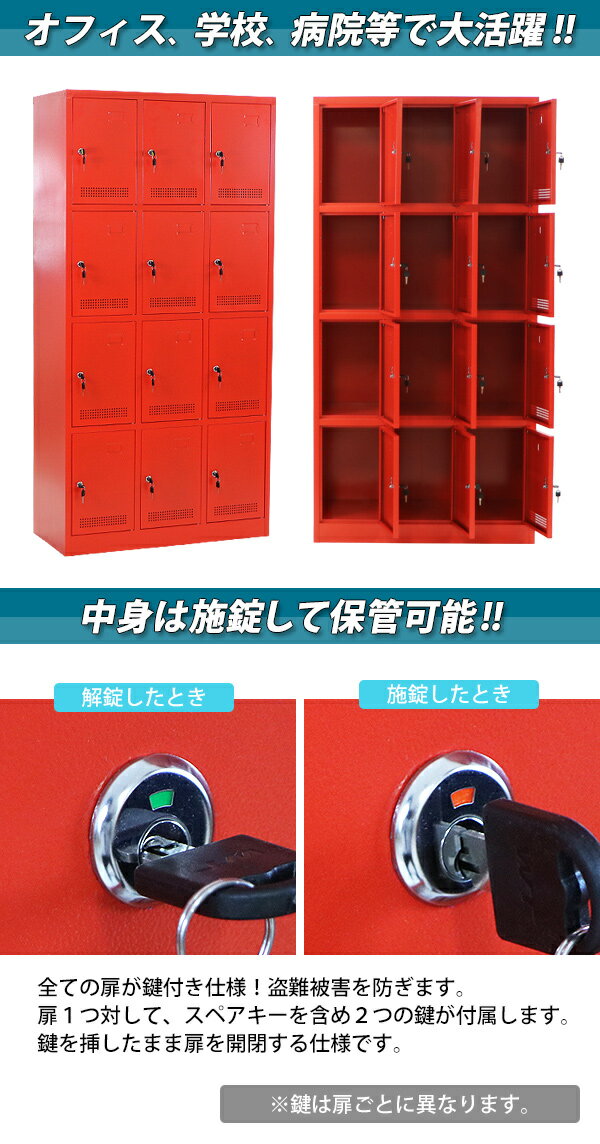 ※お届け先又は備考欄に必ず法人・事業所名をご記入下さい! 外寸 約W90×約D40×約H180(cm)(鍵は、合計24(内スペアキー12)個付属します。) 内寸 約W29×約D37.5×約H42.5(cm) 重量 約35.5kg 梱包荷姿 約W96×約D46×約H186(cm)/約39.5kg 搬入方法をご検討の上、ご購入下さい。 商品について ●こちらの商品は、新品ではありますが、輸入品につき、多少のスリ傷等ある場合もございます。 ●気になさる方は購入をお控え下さい。 送料について ●全国一律:送料無料です。(ただし、北海道、東北(青森県、秋田県、岩手県、山形県、宮城県、福島県)、沖縄、離島の方は、除きます。別途お見積もり致します。) ★1階車上でのお渡しとなります。恐れ入りますが荷降ろし・搬入は、お客様にてお願いいたします。 クレーム品について ●弊社は、出荷時に、検品を致して出荷しております。 ●万が一、商品に不具合がございましたら、商品到着日より7日以内に画像添付の上、ご連絡下さい。 ●7日以内にお知らせ頂けない場合、クレームの対応は出来ません。 ●配達時の状態に梱包の上、車上までお持ち願います。 ■搬入方法を十分ご検討の上、ご購入下さい。 ■実際の商品と上記の写真の色は、照明の関係上若干異なる場合があります。ご理解の上ご購入下さい。 ■直接のお引取りは、弊社の倉庫管理、在庫管理システム上ご遠慮いただいております。 ■吊り上げ作業などの搬入手配は、弊社では、受付しておりません。お客様ご自身で手配願います。 ■設置場所に、搬入可能かどうか、間口、廊下、エレベーター等のサイズなどは、必ずご確認下さい。 ■配送後のキャンセルは、一切お受け出来ません。よくご検討された上で、ご購入下さい。 ●商品をご確認されますまで、梱包材は保管願います。 ●万が一、商品交換をご希望されます場合は(到着後7日以内)お客様で、梱包材のご準備をお願い致します。 ●梱包材をご希望の場合は、梱包材+送料をご請求させて頂きます。 ※商品を到着時のように梱包をして頂き、1階車上まで運んで頂きますよう 宜しくお願い致します。 ★ご購入前の注意事項★ ★1階車上でのお渡しとなります。恐れ入りますが荷降ろし・搬入は、お客様にてお願い致します。 ●新品商品ではありますが、輸入商品の為、多少の擦り傷などがある場合がございますので、ご納得の上ご購入下さいませ。 ●ご購入後、お客様ご都合によるご返品、ご返金等は一切お受け致しておりません。 ●本商品を使用した際に発生したトラブル、事故につきまして、当社は一切の責任を負いません。ご使用に関しましては、全て自己責任にてお願い致します。送料無料 ロッカー おしゃれ 完成品 スチールロッカー 12人用 レッド 鍵付き スペアキー付き 3列4段 スチール キャビネット シューズロッカー シューズボックス スチールシューズボックス 12枚扉 シリンダー錠 靴箱 業務用 スリム かぎ付き 更衣ロッカー 赤 f012red ◇■完成品 スチールロッカー■◇ ■12人用のスチールロッカーです。 ■靴や手荷物、書類や本等の収納に大変便利です。 ■鍵は、24個付属しています。 ■匂いや湿気がこもりにくい、通気口付き。 ■ネームプレートを挿むことができます。 ■カラー・・・レッド ■材質・・・スチール(厚み・・約0.6mm) ■重量・・・約35.5kg ★こちらの商品は完成品ですので、組み立てる必要がありません。届いてすぐにご使用いただけます。 ★ご購入前の注意事項★ ★1階車上でのお渡しとなります。恐れ入りますが荷降ろし・搬入は、お客様にてお願い致します。 ●新品商品ではありますが、輸入商品の為、多少の擦り傷などがある場合がございますので、ご納得の上ご購入下さいませ。 ●ご購入後、お客様ご都合によるご返品、ご返金等は一切お受け致しておりません。 ●本商品を使用した際に発生したトラブル、事故につきまして、当社は一切の責任を負いません。ご使用に関しましては、全て自己責任にてお願い致します。