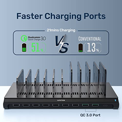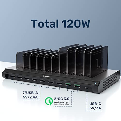 【送料無料】Unitek 2024 USB PD充電ステーション 10ポート QC3.0*2+PD45W*1 卓上充電スタンド 120W PSE認証済 10台同時充電 1.5A/2.4A/3A スマートIC搭載 複数台対応 Android/iPhone/iPad/kindle/タブレット/PSP/ラップトップ 仕切り板 間隔調整可能 収納便利 卓上