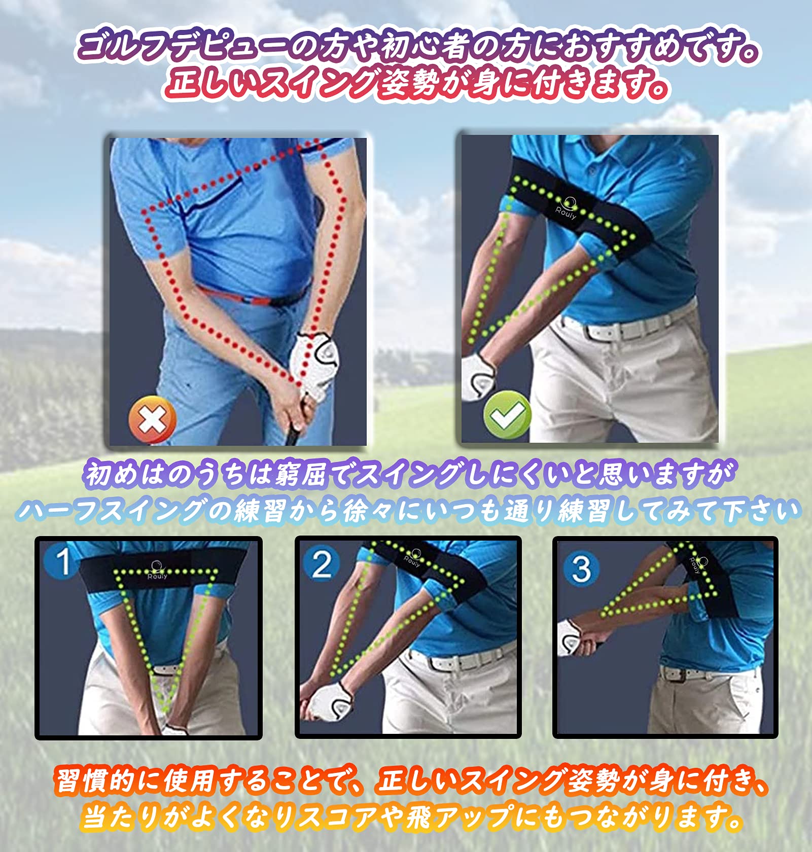 商品情報商品の説明主な仕様 ? 【ゴルフスイングを矯正し、体に覚えさせる!】ゴルフは、ゴルフボールを打ちだけじゃなくてスイングを綺麗にすることも重要です。Rouly の「ゴルフ練習スイング 矯正ベルト」は、正しいゴルフスイングのフォームを、正しいスイング練習で行える。本製品は、間違ったスイングの防止や修正を行う用途で設計しておりますゴルフ練習器具です。腕と体を正しい角度に保ち、より効率的なスイングを実現してくれで、肩の柔軟性を引き出し距離やコントロールを向上してくれますので、中級者から上級者だけではなく、ゴルフ初心者の方にも適しています。br? 【スイングを矯正の重要性】ゴルフは基礎練習は「素振り」です!まずは、素振りで理想的なスイングをしっかりと身に付けましょう。室内でできる素振りの練習には、練習用のゴルフクラブなどを使うのも良いですが、本製品のスイング矯正ベルトを使えば、室内でも素振りが行えるのでおすすめです。練習方法は至ってシンプルで、まずアドレスは脱力し、テイクバックはゆっくり動かしてください。先端が手元より遅れるぐらいのほうがいいです。手だけであげると、先端が先行するので要注意です。この素振りでは切り返しが大切です。先端部分を振り出さないようにしてください。そしてインパクトの位置で遠心力が最大になるように振り出しましょう。そしてフォロースルーで、両手がまっすぐ伸びていることを確認しましょう。この練習では切り返しのタメが覚えられ、ヘッドスピードが上がります。br? 【高品質の素材、伸縮性が高く!】伸縮性の優れた素材で設計しておりますので、長くご使用いただいても変形しにくく、非常に耐久性が高いアイテムです。弾力のあるナイロン素材を使用しておりますので、ほとんどの方の腕にフィットするようになっております。本体はコンパクトな設計ですのでゴルフバックやその他バッグに入れて手軽に持ち運びすることができます。自宅、または練習場でのゴルフトレーニングやフォーム修正、フォーム矯正に最適なゴルフ練習用品となっております。br? 【矯正ベルトで練習 〜 お悩み解決】ゴルフを始めると、(特にゴルフ初心者) スライスが強い、インパクト後の左肘の開き、テイクバッグで右肘が外へ逃げてしまうなど、様々なお悩みがあると思います。本製品のスイング矯正ベルトでスイング練習をすることで、こういったゴルフ初心者の方のお悩みを少しずつ改善していくために開発しました。br? 【使用方法】使用方法は非常に簡単な設計となっておりますので、誰でも手軽にご使用いただけます。本製品をご自身の腕に通してから装着を行い、そのままの状態でいつも通りに素振りやスイングを始動して練習を行ってみて下さい。まずは、ショートアイアンでスイングイメージを身体に覚えさせ、矯正ベルトを着けている違和感が無くなりましたら、矯正ベルトを外して通常通りスイングを行って下さい。常に着用してゴルフスイングを練習することで、綺麗なスイングを行えるようになります。