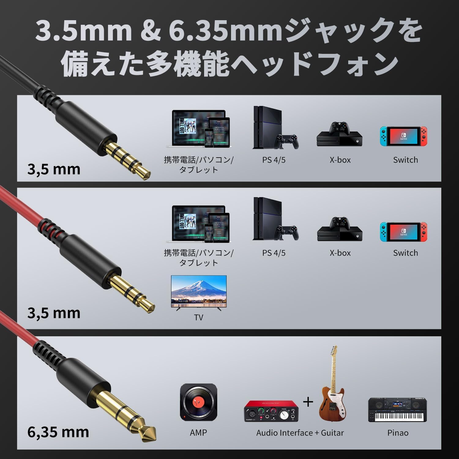 商品情報商品の説明主な仕様 【ハイレゾ対応ヘッドホン】パワフルな高音質サウンドを実現する50mmドライバーを搭載したモニターヘッドホンです。力強い低音から伸びのある中高音までしっかり再現できます。ライブでのミキシングはもちろん、音楽制作、DTMや自宅での録音など幅広いシーンで活用できます。br【2つの音源を同時再生可能】有線ヘッドフォンの両側に6.35mmと3.5mmのジャックを備えており、両方にケーブルを差し込むことで、2つの音源を同時に再生できます。シーンに合わせて選べる2種類の着脱ケーブルが付属されて、1台の機器のステレオ音楽を複数の人と同時に楽しむことができます。br【快適な装着性】人間工学に基づいて設計され、高品質で肌触りのよいオーバーイヤーイヤパッドを採用したため、柔軟性と通気性に優れ、密閉度も遮音性も高く、スタジオで長時間使用しても疲れにくいです。軽量でコンパクトに折りたためるので、収納も持ち運びも便利です。br【片耳モニタリング】ハウジング部分は前後90°上下180°反転できるモニター構造で、片耳モニタリング可能。DJだけに限らず、スタジオでもヘッドホンを首からさげてモニタリングするなら、反転モニター機構を採用したヘッドホンが便利です。日常使いはもちろん、音楽鑑賞、DJ、楽曲制作、ミックス、モニタリングなどにも対応できます。br【幅広い互換性】MP3、PS4、スマホ、電子ピアノ、電子ドラム、エレキギター、キーボードなど、3.5mmジャックまたは6.35mmジャックオーディオ接続を備えたデバイスに適しています。