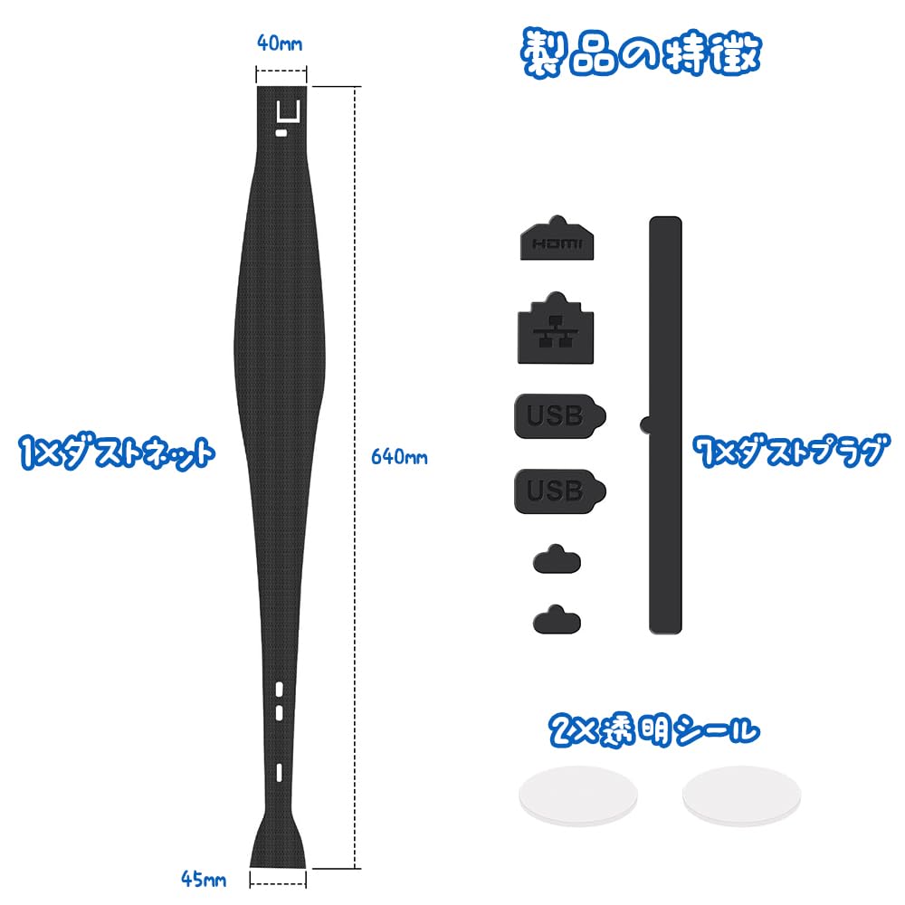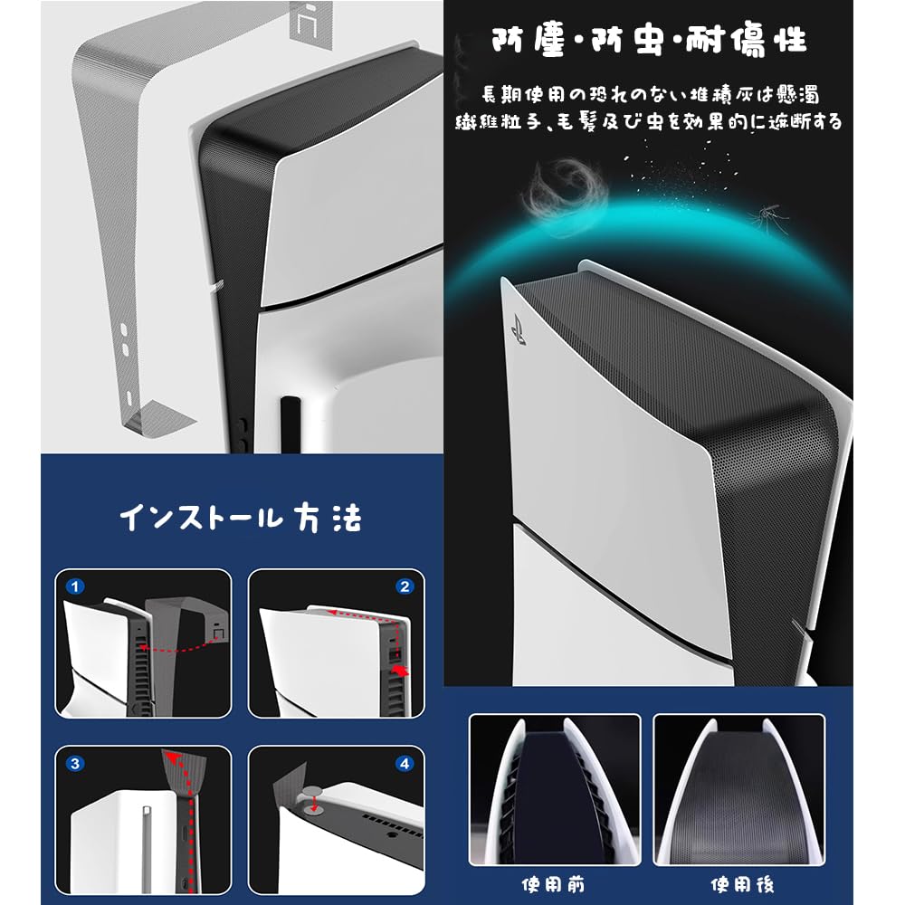 商品情報商品の説明1【PS5スリムコンソールダストカバー】 PS5スリムコンソール専用に設計されたダストカバーメッシュです。 PS5 Slimコンソールをホコリ、ペットの毛、熱の蓄積から効果的に保護するとともに、冷却ファンを追加設置する場合でも背面の適切な換気を確保します。 2【ダストネットの素材】PS5 Slimコンソールのダストネットは、ソフトで耐久性に優れた環境に優しい素材を使用しています。 傷の防止と安全な使用を保証するために、カーブしたエッジを持つ中空のスナップクロージャーを採用しています。 ステッカーを貼る必要がなく、PS5スリムの構造にぴったりとフィットするため、ゲーム機を傷つける心配がありません。 3【再利用可能】汚れたら水で洗うだけで新品同様になります。 このダストカバーの新バージョンは、PlayStation 5 Slim本体のディスク版とデジタル版の両方に適合します。 4【ポート防塵シリコンプラグ】防塵シリコンプラグを対応するUSB、HDMI、電源コンセントなどのポートに接続することで、PS5スリム本体を効果的に保護し、髪の毛やホコリがポートに入るのを防ぎます。 5【パッケージ】PS5スリムホストカバー*1、ポートシリコンプラグ*7 (面倒な取り付け手順は必要ありません。貴重な時間を数分費やすだけで、PS5スリムコンソールをより良く保護することができます)。主な仕様 【PS5スリムコンソールダストカバー】 PS5スリムコンソール専用に設計されたダストカバーメッシュです。 PS5 Slimコンソールをホコリ、ペットの毛、熱の蓄積から効果的に保護するとともに、冷却ファンを追加設置する場合でも背面の適切な換気を確保します。br【ダストネットの素材】PS5 Slimコンソールのダストネットは、ソフトで耐久性に優れた環境に優しい素材を使用しています。 傷の防止と安全な使用を保証するために、カーブしたエッジを持つ中空のスナップクロージャーを採用しています。 ステッカーを貼る必要がなく、PS5スリムの構造にぴったりとフィットするため、ゲーム機を傷つける心配がありません。br【再利用可能】汚れたら水で洗うだけで新品同様になります。 このダストカバーの新バージョンは、PlayStation 5 Slim本体のディスク版とデジタル版の両方に適合します。br【ポート防塵シリコンプラグ】防塵シリコンプラグを対応するUSB、HDMI、電源コンセントなどのポートに接続することで、PS5スリム本体を効果的に保護し、髪の毛やホコリがポートに入るのを防ぎます。br【パッケージ】PS5スリムホストカバー*1、ポートシリコンプラグ*7 (面倒な取り付け手順は必要ありません。貴重な時間を数分費やすだけで、PS5スリムコンソールをより良く保護することができます)。