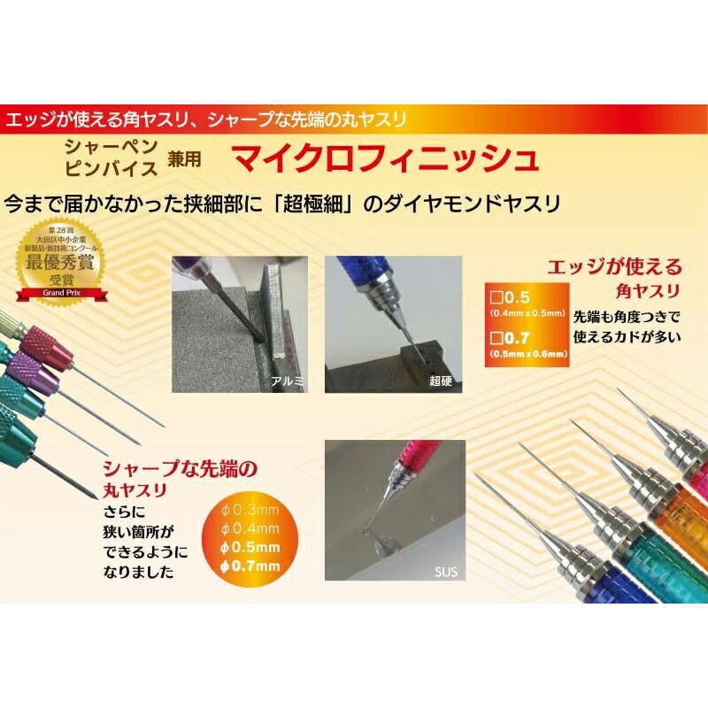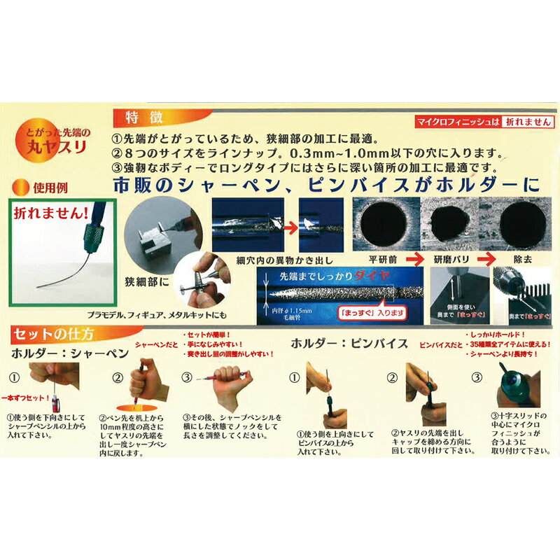 【0.9、1.0mmはシャーペンには入りません】 先端が尖っているため、狭細部の加工に最適。 8つのサイズをラインナップ。0.3-1.0mm以下の穴に入ります。 マイクロフィニッシュは折れません 両側使えて2倍お得 プラモデル、フィギュア、メタルキット等のスジボリ、ベリやめくれ処理に金型の微調整、精密部品等のマイクロバリ除去、複雑な形状部の補修、従来工具で届きにくい場所、小径ドリル等のは先処理、時計部品等の細かい箇所、放電加工後の電解層の除去類似商品はこちら超極細ダイヤモンドヤスリ マイクロフィニッシュ3,447円超極細ダイヤモンドヤスリ マイクロフィニッシュ3,447円超極細ダイヤモンドヤスリ マイクロフィニッシュ3,590円ヤスリのみ 超極細ダイヤモンドヤスリ 10本セ11,869円ヤスリのみ 超極細ダイヤモンドヤスリ 5本セッ6,864円ヤスリのみ 超極細ダイヤモンドヤスリ フリーチ3,432円ヤスリのみ 超極細ダイヤモンドヤスリ 10本セ11,869円ヤスリのみ 超極細ダイヤモンドヤスリ 10本セ14,300円ヤスリのみ 超極細ダイヤモンドヤスリ 5本セッ8,209円【メーカー在庫となります。在庫切れの場合はご連絡させていただきます】【北海道・沖縄・離島送料別途見積もり商品】【お客様都合の返品の場合返品手数料がかかります】