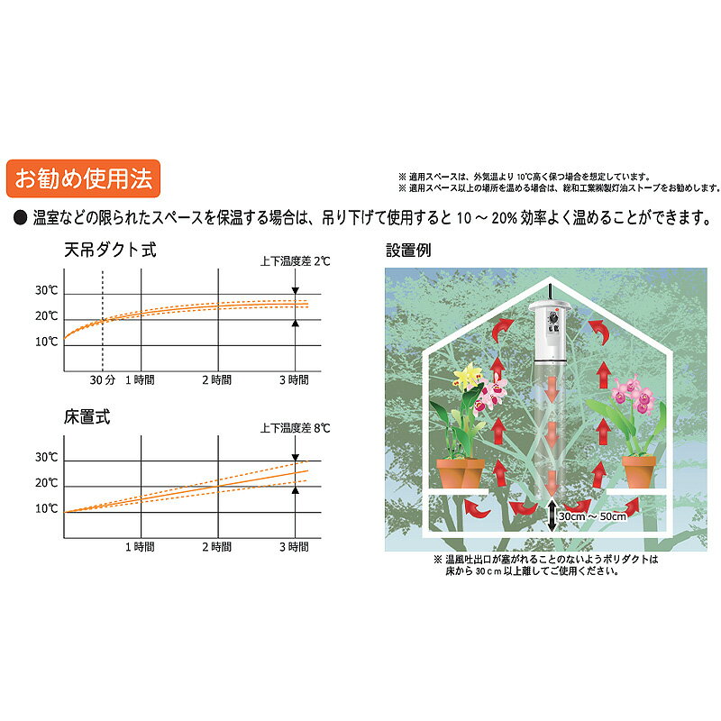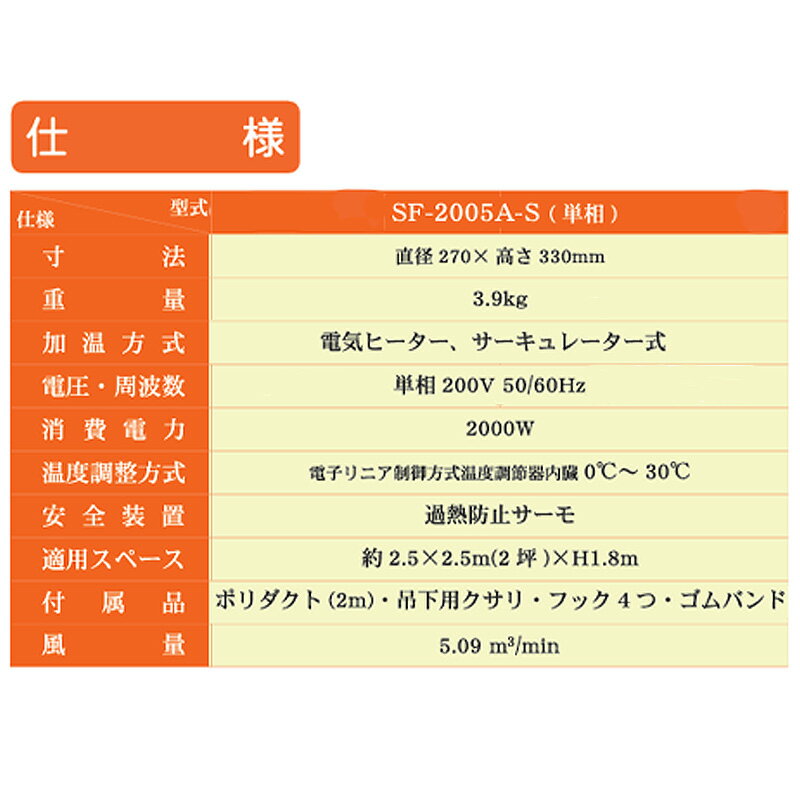 室温コントロール機能付電気温風器 温度管理が簡単にできるスペースにあわせた3タイプ ・電気温風器と循環扇をドッキングしたサーキュレートヒーターです。 ・上下温度差を解消し暖房費が10〜20%節約になります。 ・吊り下げ式なので設置スペースを取りません。 ・過熱防止装置付なので安全です。 ・サーモスタット内蔵です。 ・温室などの限られたスペースを保温する場合は、吊り下げて使用すると10?20%効率よく温めることができます。 ・限られたスペースを乾燥室としてご使用される場合は、外の空気を温めてから入れます。 寸法:直径270×高さ330mm 重量:3.9kg 加温方式:電気ヒーター、サーキュレーター式 電圧・周波数:単相200V 50/60Hz 消費電力:200W 温度調整方式:電子リニア制御方式温度調節器内蔵0℃?30℃ 安全装置:加熱防止サーモ 適用スペース:約2.5×2.5m(2坪)×H1.8m 付属品:ポリダクト(2m)・吊下用クサリ・フック4つ・ゴムバンド 風量:5.09?/min類似商品はこちら園芸用電気温風器 SF-2005A-T 27049,478円園芸用電気温風器 SF-1016A 270×343,930円温度計 新木製寒暖計 45cm 10個 寒暖計44,531円ミツバチ用燻煙器 安全ガード付 FD-132829,172円ミツバチ用燻煙器 安全ガードなし FD-13223,738円農電マット 1-417 ノーデン園芸マット 51,094円みくに式 覆土専用機 覆土機 ガードレール付 12,206円レベルアジャスター 単管ジョイント KC-271,086円レベルアジャスター 175mm 穴付 KC-21,239円新着商品はこちら2025/11/22ポリポット 15cm 25枚入 20セット マ15,845円2025/11/22ポリポット 12cm 25枚入 40セット マ17,790円2025/11/22ポリポット 10.5cm 25枚入 60セット20,936円再販商品はこちら2025/11/225本 ハイホワイトシルバー 2.3×25m 育57,687円2025/11/22ペレット種子 150粒 ハクサイ 無双 品番3580円2025/11/22ペレット種子 100粒 ハクサイ オレンジクイ580円2025/11/22 更新温度管理が簡単にできるスペースにあわせた3タイプ