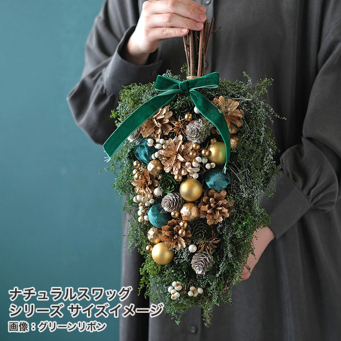 吊るすだけで簡単にナチュラルテイストな空間の引き立てに。前面のみボリュームのある、半立体型で使いやすいクリスマススワッグです。【サイズ】約幅210×奥行110×高さ380mm(平均)【素材】天然素材・ポリプロピレン・プラスチック・綿・発泡スチロール・ポリエステル・木・ポリ塩化ビニール【仕様】壁掛け用ひも付き、一部パーツにラメあり※入荷時期および個体によって色、柄、サイズ、形状が多少異なる場合がございます。※天然素材のため、1点ずつ色合い・風合いが異なります。※ラメは素材の特性上、剥がれ・落ちが発生いたしますのでご了承ください。※素材の特性上、輸送時にパーツ剥がれや変形等がある場合がございます。接着剤等を使って補修して頂きますようお願いいたします。ウォールデコレーション 壁掛け 装飾 季節 インテリアGREEN HOUSE(グリーンハウス) CM1727*ナチュラルスワッグ シリーズナチュラルリボンレッドリボングリーンリボン