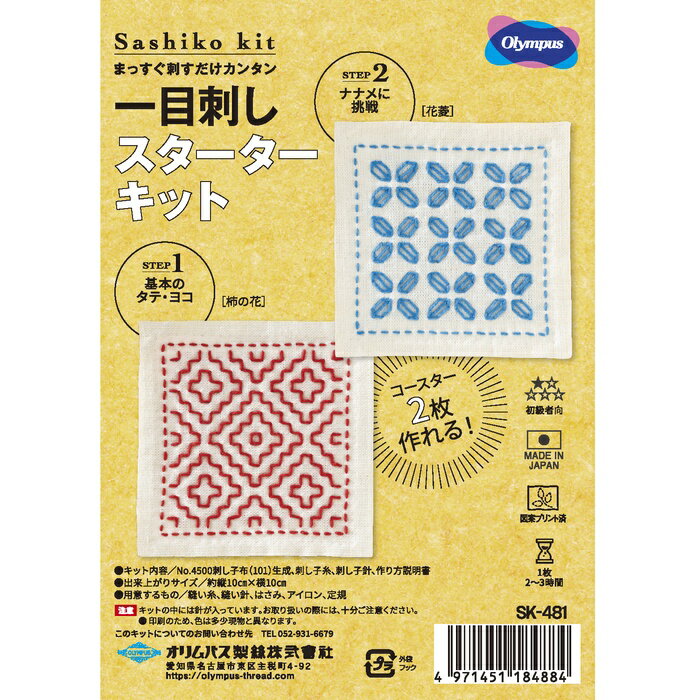 ※カラー選択無 商品情報明細 メーカー オリムパス製絲 商品名 オ)SK481 柿の花・花菱 商品名 柿の花・花菱 デザイン者 使用用具 縫い糸、縫い針、はさみ、アイロン、定規 出来上がりサイズ 約縦10cm×横10cm 販売単位 1組 キット内容 No4500刺し子布、刺し子糸、刺し子針、作り方説明書 原産国 日本 商品紹介 オリムパス製絲 まっすぐ刺すだけカンタン コースター2枚作れる! 一目刺しスターターキット刺し子をはじめてみたい方にオススメ!1枚2〜3時間で作ることができます。STEP1の簡単なタテ・ヨコの柄からスタートできる初心者向けキットです。STEP2のナナメをプラスした柄に挑戦してステップアップすることができます! サイトからのご注意 色番リストに載っていない色番はご注文できません。 メーカー品切れ情報が入り次第、リストからはずしております。 更新作業の特性上、情報が遅れる場合がございます。ご了承下さい。 モニターの性質上実際の色味と色に差異が生じる場合が御座います。 ※表示価格は販売単位の価格です。お届けの目安 この商品は、ご発送迄に7営業日程頂いております。【取寄商品】の為、発注タイミングによっては欠品の場合もございます。 メーカー品切れ情報が入り次第、販売から外しておりますが、更新作業の特性上情報が遅れる場合がございます。7営業日以上かかる場合は別途ご連絡させて頂きますので予めご了承くださいませ。 メーカー希望小売価格はメーカーカタログに基づいて掲載していますオ)SK481 柿の花・花菱