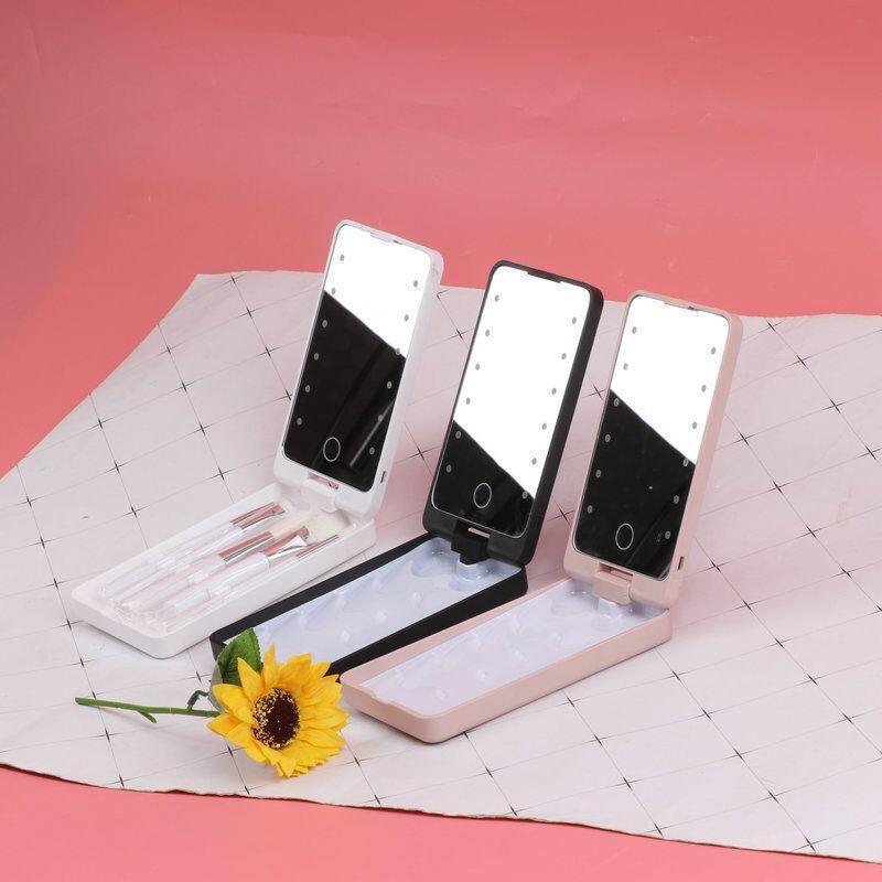 LEDミラー コンパクトミラー メイクブラシセット ライト付き 充電式 折り畳み 360度 回転 リチウム 持ち運び 携帯 化粧筆 ケース入り おしゃ