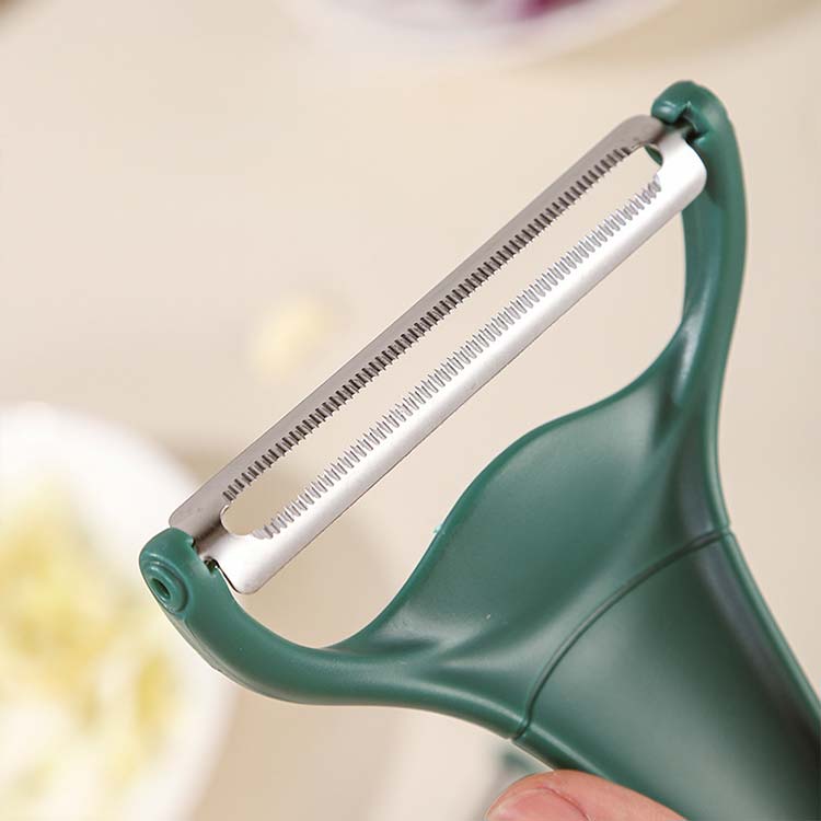 千切りキャベツを手早く大量に作れる、2枚刃構造のピーラーステンレス製2枚刃を採用。1枚刃の従来品に比べ、2倍のスピードで手早く千切りキャベツを作ることができます。刃先には鋭い高密度三角刃が約2mm間隔で並び、食材の繊維をサクサクと切り刻むことで、ふわふわでシャキシャキな千切りキャベツが簡単に作れます。細かく均一性があるので見栄えも良し。三角刃で削ることで断面が波状になり、ドレッシングなど調味料の味が染みこみやすくなるのも特長です。使い方はキャベツに沿って軽く引き下ろすだけ。まな板も包丁も必要ありませんので、時短調理ができ、洗い物も少なく済みます。グリップに指をかけると圧が掛かり、軽い力で引けるので使いやすいです。玉ねぎ、大根や人参など根菜類の薄切りにも使うことができ、根菜を葉野菜感覚でお召し上がりいただけます。半玉キャベツを無駄なくカットする方法キャベツの芯に親指をかけ、キャベツの外周から削ると無駄なく使えます。ポイントは、キャベツの断面の角からスゥーっと撫でるように削ること。逆に力を入れすぎるとスムーズに削れません。食材が小さい場合は、先端にフォークを刺して、固定して引いてください。注意事項:刃が鋭いので安全のため、使用の際は厚手のゴム手袋の着用を推奨しています。 サイズ 10.5*18cm サイズについての説明 写真通り※サイズ表の実寸法は商品によって1-3cm程度の誤差がある場合がございます 素材 ABS+ステンレス 色 2個グリーン 備考 ●サイズ詳細等の測り方はスタッフ間で統一、徹底はしておりますが、実寸は商品によって若干の誤差(1cm~3cm )がある場合がございますので、予めご了承ください。 ●製造ロットにより、細部形状の違いや、同色でも色味に多少の誤差が生じます。 ●パッケージは改良のため予告なく仕様を変更する場合があります。 ▼商品の色は、撮影時の光や、お客様のモニターの色具合などにより、実際の商品と異なる場合がございます。あらかじめ、ご了承ください。 ▼生地の特性上、やや匂いが強く感じられるものもございます。数日のご使用や陰干しなどで気になる匂いはほとんど感じられなくなります。 ▼同じ商品でも生産時期により形やサイズ、カラーに多少の誤差が生じる場合もございます。 ▼他店舗でも在庫を共有して販売をしている為、受注後欠品となる場合もございます。予め、ご了承お願い申し上げます。 ▼出荷前に全て検品を行っておりますが、万が一商品に不具合があった場合は、お問い合わせフォームまたはメールよりご連絡頂けます様お願い申し上げます。速やかに対応致しますのでご安心ください。