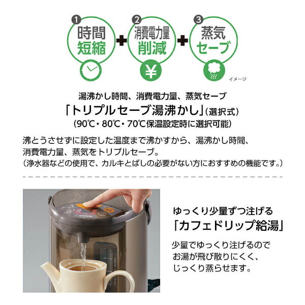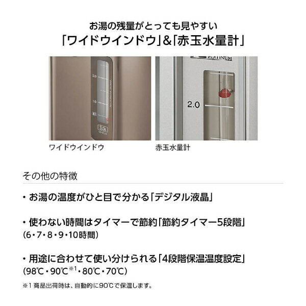 商品説明★ 湯沸かし時間、消費電力量、蒸気「トリプルセーブ湯沸かし」(選択式)90℃・80℃・70℃保温設定時に選択可能沸とうさせずに設定した温度まで沸かすから、湯沸かし時間、消費電力量、蒸気をトリプルセーブ。(浄水器などの使用で、カルキとばしの必要がない方におすすめの機能です。)★ お湯の温度がひと目で分かる「デジタル液晶」★ ゆっくり少量ずつ注げる「カフェドリップ給湯」少量でゆっくり注げるのでお湯が飛び散りにくく、じっくり蒸らせます。★ 使わない時間はタイマーで節約「節約タイマー5段階」6・7・8・9・10 時間★ 用途に合わせて使い分けられる「4段階保温設定」98℃・90℃・80℃・70℃★ お湯の残量がとっても見やすい「ワイドウインドウ」&「赤玉水量計」スペック* 容量(L):2.2* 消費電力…・湯沸かし時(W):700・年間消費電力量:362kWh/年・一日あたりの消費電力量:0.99kWh/日* お湯を沸かす時間:約24分* 沸とう後希望の湯温になるまでの時間100℃→70℃(室温23℃、1L):約1時間10分* 電源コード(m):1.0* 寸法(幅×奥行×高さ(約cm)):21×28.5×25* 質量(約kg):2.2* 生産国:中国