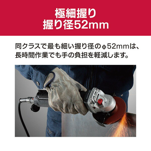 商品説明★ 金属等の切断・研削に★ スイッチがONの本体に、通電中の脱着コードを誤って繋いでも動作しない再起動防止機能付き★ 直径52mmの握り径と後部を絞り込むデザインで、抜群の握りやすさ★ 切断時に切り込み深さを一定に保てる丸形ヘッド★ クラスで最も低いスリムギヤヘッドで狭いところも入り込める★ 鉄粉の侵入を防ぐメッシュフィルター付きの防じんフィルター★ 防じん性に優れたラビリンス構造※ ご使用の前に取り扱い説明をよくお読みになり、正しくご使用ください。※ 安全保護具を使用して下さい。※ 電源コードを乱暴に扱わないでください。※ 研磨・研削・切断以外の用途には使用しないでください。※ 誤って落としたり、ぶつけたときは、本体などに破損や亀裂、変形がないことをよく点検してください。※ 工具類や付属品は、取扱説明書に従って確実に取り付けてください。スペック* 握り径:52mm* 砥石径:外径100×内径15mm* 定格速度:9.500min-1、低速型* 電源:単相AC100V(50/60Hz)* 電流:7.5A* 消費電力:730W* 最大出力:980W* 絶縁方式:二重絶縁* 本体サイズ:長さ287×幅117×高さ88mm* 質量:1.6kg* 材質・ハウジング:PA・ギヤケース:アルミ* 付属品:カニ目スパナ