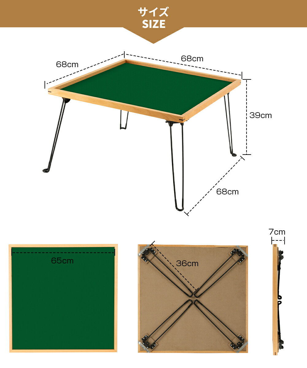 商品仕様 商品名:麻雀卓 折りたたみ 家庭用 手打ち 麻雀卓単品 ・ 本体サイズ(約):幅68×奥行68×高さ39cm ・ 収納サイズ(約)::幅68×奥行68×高さ7cm ・ マット部サイズ:幅65×奥行65cm ・ 重量:5.2kg ・材質:天然木、ゴム 特徴 ●高さ39cm、椅子は不要で、和室でも洋室でも大活躍! ●持ち運び便利、収納後厚さは約7cmで使わない時はスムーズに折りたたみ可能。 ●家庭/麻雀クラブ/麻雀教室/老人ホームなどに最適。 セット内容 麻雀卓本体×1(ご注意:麻雀牌は別途でご購入ください。) 注意事項 ※モニターの都合上、写真と実際の色が異なる場合がございます。 ※サイズは、実寸サイズを測っているため多少誤差がでる場合があります。 検索用キーワード 麻雀卓 麻雀台 麻雀テーブル 折りたたみ式 収納式 手打ち用 マージャン卓 68cm×68cm 折り畳み式 木製麻雀卓 軽量 5.2Kg コンパクト収納 手積み麻雀卓商品仕様 商品名:麻雀卓 折りたたみ 家庭用 手打ち 麻雀卓単品 ・ 本体サイズ(約):幅68×奥行68×高さ39cm ・ 収納サイズ(約)::幅68×奥行68×高さ7cm ・ マット部サイズ:幅65×奥行65cm ・ 重量:5.2kg ・材質:天然木、ゴム 特徴 ●高さ39cm、椅子は不要で、和室でも洋室でも大活躍! ●持ち運び便利、収納後厚さは約7cmで使わない時はスムーズに折りたたみ可能。 ●家庭/麻雀クラブ/麻雀教室/老人ホームなどに最適。 セット内容 麻雀卓本体×1(ご注意:麻雀牌は別途でご購入ください。) 注意事項 ※モニターの都合上、写真と実際の色が異なる場合がございます。 ※サイズは、実寸サイズを測っているため多少誤差がでる場合があります。 検索用キーワード 麻雀卓 麻雀台 麻雀テーブル 折りたたみ式 収納式 手打ち用 マージャン卓 68cm×68cm 折り畳み式 木製麻雀卓 軽量 5.2Kg コンパクト収納 手積み麻雀卓