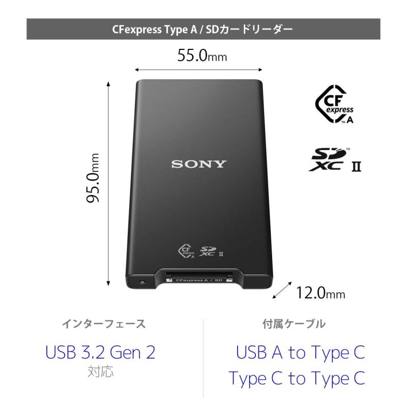 ソニー CFexpress Type A SDメモリーカード対応 カードリーダー MRW-G2CFexpress Type AとSDメモリーカードに対応USB 3.2 Gen 2対応でCFexpress Type A、UHS-II SDのスピードを発揮USB-C to USB-C、USB-C to USB-Aのケーブル2本を付属メーカー:ソニー(SONY)商品モデル番号:MRW-G2