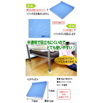 「北海道・沖縄・離島・一部地域へのお届けは別途送料を請求させていただきます。」「お客様都合でのキャンセルの場合、出荷前後にかかわらずキャンセル料などの手数料が発生いたしますので予めご了承ください。」「メーカーより取り寄せ商品のため、在庫状況によっては欠品・廃盤の可能性があります。あらかじめご了承ください。」ソファの足の下に置くだけカンタン!半透明タイプでコンパクトサイズなので目立ちにくいです。色移りしにくい半透明シリコーンゴムを使用しています。リラックスタイムをより快適に!ソファやベッドに使えるすべり止めマット!すべり止め/ずれ防止/家具用/ソファ/ベッド/脚/日用品/便利グッズ/アイデア商品/リビング/手軽/床サイズ約W7.4×L7.4×H1cm個装サイズ:10×16×4cm重量35g(1枚あたり)個装重量:142g素材・材質シリコーンゴム生産国日本fk094igrjs