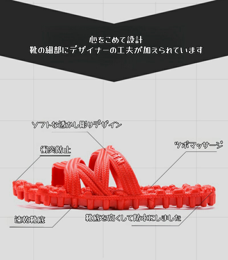 商品情報材質靴の表面 PVC靴底 ゴムタイプベーシックタイプレッドベーシックタイプピンクベーシックタイプライトグレーベーシックタイプブラックアップグレードレッドアップグレードパープルアップグレードライトブルーアップグレード透明アップグレードダークブルーアップグレードブラックサイズ35-36 37-38 39-40 41-42 43-44靴底の高さ2cmアップグレードタイプとベーシックタイプの区別アップグレードタイプは厚めの素材を使用しているため、ベーシックタイプの力がマッサージより強く、ベーシックタイプよりも少し痛くなります。マッサージの方が効果的です.商品について新しいPVCは強靭で弾力性に優れていますアンチエイジング,耐臭,無毒という特徴もあります 柔らかいくて耐磨耗も抜群。3D立体靴型は歩く時の足から靴への圧力をマッサージ力に変えます。靴底を高くして防水にしました。注意事項※商品写真はできる限り実物の色に近づけるよう加工しておりますが、撮影の照明やスマホ機種が異なる為、画質等の関係上に色合いが実際の商品と若干違うこともあるかもしれませんが、イメージ違いの理由としての返品は承りかねます。予めご了承ください。送料無料 足裏 室内履き PVC素材バススリッパ 水切り 健康サンダル 足ツボ 穴あき サンダル マッサージスリッパ 足つぼ レディース メンズ 一年中使えます 3Dシミュレーション 滑り止め 足マサージ足裏 室内履き バススリッパ 水切り 健康サンダル 10種類 滑り止め 5