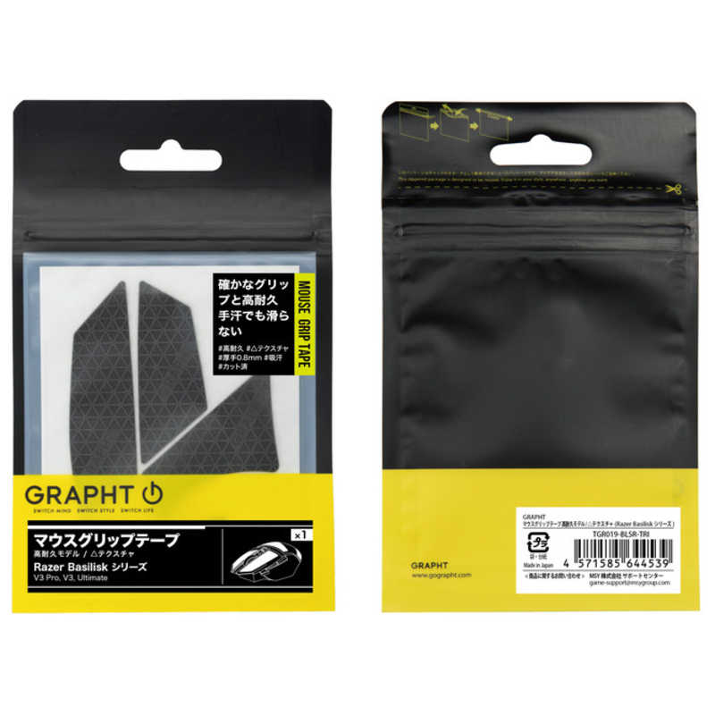 【商品解説】『GRAPHT マウスグリップ』は付けることによって手の乾燥、手汗などのあらゆる状況でも、グリップ力があり、安定したマウス操作が可能になります。肉厚の凹凸のギャップにより、かぶせ持ち、つかみ持ち、つまみ持ちといったどのような持ち方でも、しっかりとしたグリップ感覚を得られます。●コンセプトGRAPHT マウスグリップをマウスに貼り付けることで、通常のマウス表面では実現できないほどの滑り止め性能が得られます。それにより、指や手のひらのズレが無くなりマウス操作の正確性が高まります。また手が乾燥した状態でも、手汗をかいた状態でもグリップ力が維持されるので、コンディションを問わず安定した操作が可能になります。●グリップ性能・グリップテープ表面は発砲ウレタンの弾力とシリコンコートされた表皮により指先の滑りを軽減します。・手汗をかいた状態でもレーザーエッチング凹凸加工による発砲ウレタン素材とそのシャープエッジにより汗を吸収し指先や手のひらの滑りを軽減します。・肉厚の凹凸のギャップにより、かぶせ持ち、つかみ持ち、つまみ持ちといったどのような持ち方でも、しっかりとしたグリップ感覚を得られます。●操作性能・グリップ性能の向上により、手のひらや指先が滑ることによる細かな操作ズレを防ぎ、正確なマウス操作が可能になります。・手が乾燥した状態でも、手汗をかいた状態でもグリップ力は維持され、コンディションや持ち方を問わず安定した正確な操作が可能です。・テープの厚みを活かし、マウスを握ったときのフィーリングを変化させ、操作性を向上させることも可能です。●素材性能・柔軟性のある発砲ウレタンとシリコンコーティングにより大きな摩擦力でグリップできます。・摩耗性能に優れ高い耐久性があますので、長時間性能を維持します。・微細なレーザーエッチング加工パターンにより指先のグリップ感触が向上し滑りを軽減をさせます。・粘着テープは剥がしたときに糊残りしにくく、貼り直しが可能で、定着させれば粘着力は安定し、簡単に剥がれません。【スペック】●型式:TGR019-BLSR-TRI(TGR-019BLSR-TRI)●JANコード:4571585644539仕様1:[対応マウス]BasiliskV3Pro/BasiliskV3などBasiliskシリーズ[入数]1セット(2g)[テープ本体]ポリウレタン[コーティング]シリコーン[粘着剤]アクリル[サイズ]厚さ:0.8mこの商品は宅配便でお届けする商品です出荷可能日から最短日時でお届けします。※出荷完了次第メールをお送りします。配送サービス提供エリアを調べることができます「エリア検索」をクリックして、表示された画面にお届け先の郵便番号7桁を入力してください。ご購入可能エリア検索お買い上げ合計3,980円以上で送料無料となります。※3,980円未満の場合は、一律550円(税込)となります。●出荷可能日から最短日時でお届けします。(日時指定は出来ません。) ※お届け時に不在だった場合は、「ご不在連絡票」が投函されます。 「ご不在連絡票」に記載された宅配業者の連絡先へ、再配達のご依頼をお願いいたします。●お届けは玄関先までとなります。●宅配便でお届けする商品をご購入の場合、不用品リサイクル回収はお受けしておりません。●全て揃い次第の出荷となりますので、2種類以上、または2個以上でのご注文の場合、出荷が遅れる場合があります。詳細はこちら■商品のお届けについて商品の到着日については、出荷完了メール内のリンク(宅配業者お荷物お問い合わせサービス)にてご確認ください。詳しいお届け目安を確認する1度の注文で複数の配送先にお届けすることは出来ません。※注文時に「複数の送付先に送る」で2箇所以上への配送先を設定した場合、すべてキャンセルとさせていただきます。