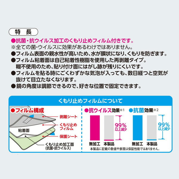 浴室で鏡がくもらない!くもり止めフィルム付のお風呂ミラーSサイズ。何度でも貼り直しができ、気泡が入りにくいフィルムになっています。糊不使用のため、貼り付け面にはがし跡が残りにくい。入浴時にシャワーで濡らすことで、表面に水の層を作ってくもりを防ぎます。ゆがみが少ない!樹脂製なのにゆがみが少ない貼り合せ二重構造。簡単貼るだけ、キレイにはがせる!吸着シートで取り付けラクラク。数回繰り返して貼ってはがせます。 取り外してお掃除OK。はがし跡が壁に残らないから賃貸でも安心。タテ・ヨコどちらでも使えます。取り付けられるところ吸着シートより大きいタイル、模様のないステンレス、冷蔵庫・洗濯機などの金属塗装面、プラスチック面、透明ガラス、スチール製品(キャビネット・机・パーテーションなど)、プリント合板。取りつけられないところ凹凸、ザラザラ、ツヤ消し面やキズのある面。模様のあるタイル・模様のあるステンレス、木壁、布壁、壁紙、ビニル壁紙、しっき、モルタル、スリガラス、塗装壁、塗装合板など。レンジ・ストーブなどで高温になるところ。ご注意割れにくい樹脂製の鏡ですが、無理な力で曲げたり強いショックを与えると破損することがありますのでご注意ください。70℃以上の熱湯、ベンジン・シンナー・カビ取り剤などの薬剤、シャンプー、石鹸、タワシ、クレンザー等は使用しないでください。毛染め剤等による着色にご注意ください。サイズ(約)本体/横17×縦22cm フィルムサイズ/横15×縦20cm重量(約)209g材質鏡/アクリル・スチロール樹脂 くもり止めフィルム/PET品番B00498製造国中国メーカーレック関連キーワード: 鏡 かがみ 曇り止め お風呂用 簡単取付 角型 親水性 ミラー 浴室 バスルーム お風呂場 洗面所 脱衣所 キッチン リビング 寝室 縦22 横17 cm センチ スマート スタイリッシュ モダン 便利 おすすめ 人気 おしゃれ 使いやすい コンパクト mirror Adsorption sheet wall surface bath room sucker バスグッズ お風呂グッズ バス用品 貼ってはがせる 跡が残らない 賃貸住宅 アパート 縦横自由 ミラー 4903320163270