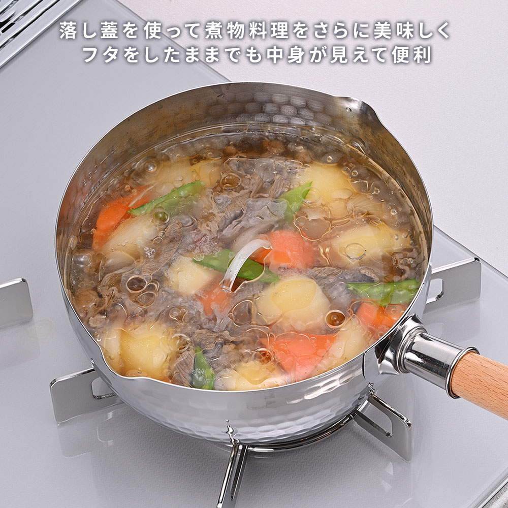 調理具合が見えて安心フタをしたままでも、調理具合が見えやすい透明な落し蓋。落とし蓋を使って美味しく調理均一な味の仕上がりに、煮物調理での具材の煮崩れ防止に。煮汁の蒸発防止や、肉や魚の生臭さを逃がします。ガラスとプラスチックの良いとこどりガラスのような高い透明度だから、蓋をしたまま火力調節の目安や味の染み込み具合など、中の具材を確認できます。プラスチックに比べて、耐熱性に優れ(耐熱180℃)、酸やアルカリにも強く、油汚れが落としやすい素材です。お手入れしやすい軽くて割れにくく、熱にも強いので、食洗機にも対応しています。アクをほどよく取り除くシボ加工外周には灰汁を取りやすくするための細かい凹凸がついたシボ加工を施してあります。取り出しやすいつまめるフック付き中央部につまみが付いているので、鍋から取り出しやすくなっています。ご注意耐熱温度内でご使用ください。コンロ等、火のそばに置かないでください。調理中や直後は非常に熱くなっているので、必ずミトンやふきん等を使用してください。食材の色素で変色する場合がありますが、ご使用上問題はありません。対応する鍋内径16cm以上の鍋に対応しています。サイズ(約)幅15×奥行15×高さ2cm重量(約)33g材質本体/ポリメチルペンテン耐熱温度180度対応する鍋16cm以上品番RE-7520製造国日本メーカー和平フレイズ商品バリエーションあわせて買いたい関連キーワード: 国産 おうちごはん 家事ラク 家事楽 おうちカフェ 丁寧な暮らし 灰汁取り 食洗器 対応 食器洗い乾燥機 煮魚 筑前煮 ぶり大根 角煮 味噌煮 かぼちゃ 煮込み料理 キッチンツール 調理用品 キッチン用品 小鍋 小さい Sサイズ 15 cm センチ 洗いやすい おせち シンプルな暮らし 自炊 常備菜 おかず お弁当作り 4903779475207