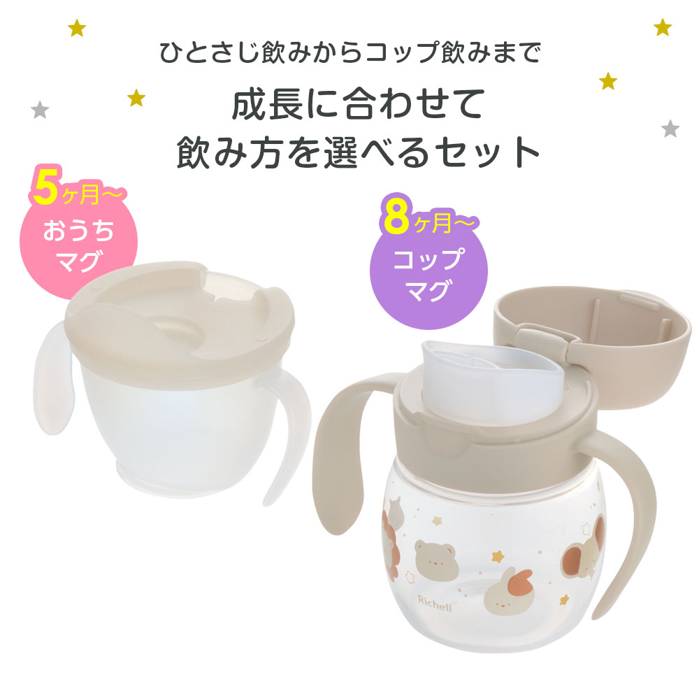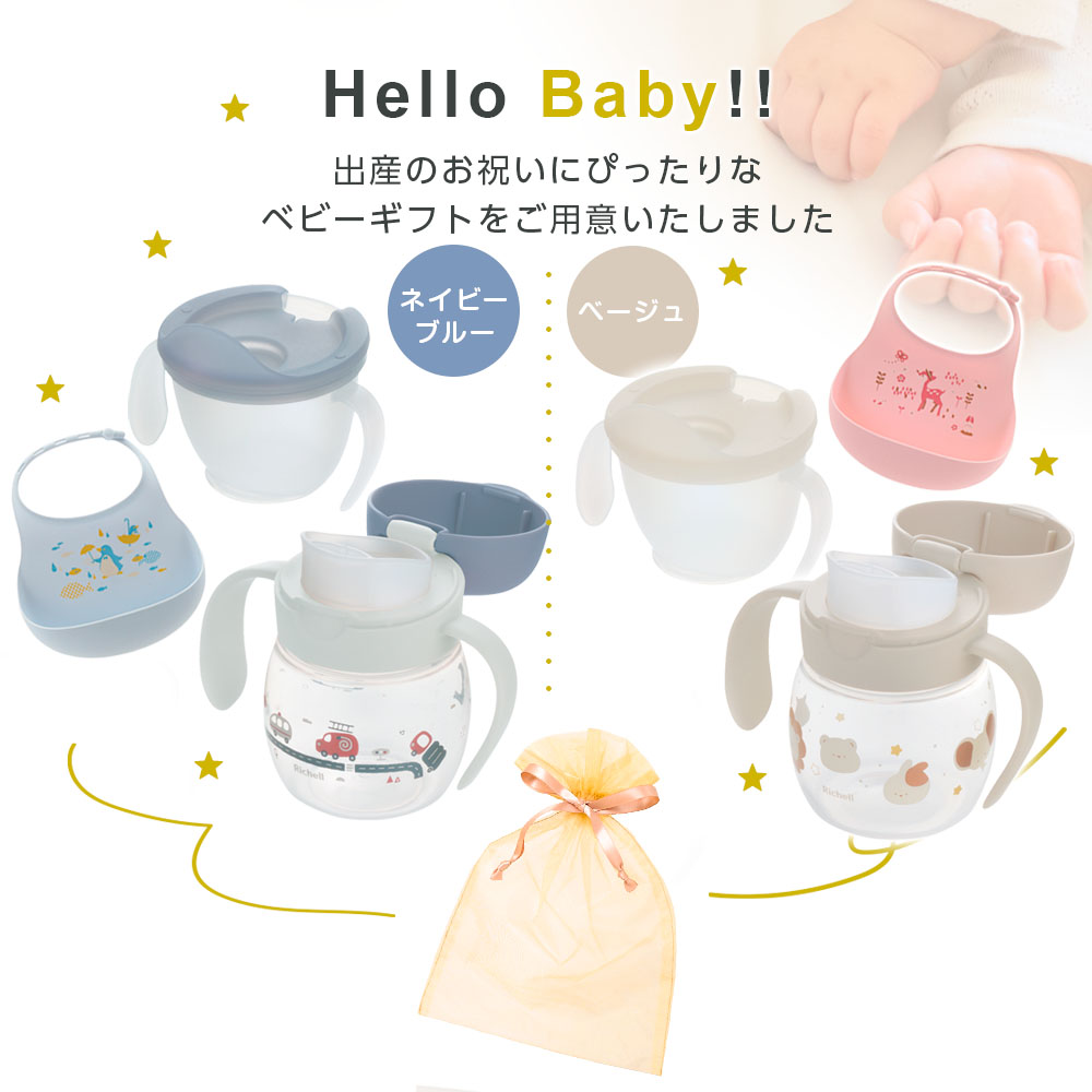 出産祝いのプレゼントにコップ飲みの練習ができるマグセットと、おでかけにも便利なシリコーン素材のスタイのセット。お選びのマグのカラーに合わせたスタイをお付けいたします。かわいいギフト包装つきで、大切な贈り物をドレスアップしてお届けします。セット内容リッチェル トライ コップ飲みマスターセットリッチェル おでかけランチくん 食べこぼしキャッチしやすいお食事スタイコップ飲みマスターセットおうちでコップ飲みの練習ができるカップと、おでかけ時にも使用できるコップマグのセット。おうちカップは飲み物をひとさじずつためて、すすり飲みの練習ができます。1プッシュで適量が出ます。コップでの飲み方に慣れるために、フタの縁で練習。小さなお口でもこぼさずに飲めます。フタを外してコップ飲みができれば、コップ飲みマスターです。コップマグは飲み口をくわえるだけで、弁が開閉するので、はじめてでも飲みやすいです。2つの弁で噴き出しを防ぎ、漏れないので安心して使えます。※「漏れない」とは誤使用、空気弁の破損や経年劣化による場合などを除きます。なお、本品は完全密封ではありません。カバーを開いた状態で、横倒しで数分間放置したり、振ったりすると中の飲み物が漏れる可能性があります。ハンドルが手前に傾いているので、自分で飲みやすいです。飲み口とパッキンが一体型で、お手入れが簡単です。シリコーンスタイコンパクトにたためておでかけに便利なシリコーンスタイ。サッと丸洗いでき、水切れがよい素材です。大きなポケットが食べこぼしをしっかりキャッチしてくれます。食器洗い乾燥機対応で、お手入れが簡単です。梱包について商品を外装箱ごとギフトラッピング袋に入れリボンを結んだものを、段ボールに入れてお届けいたします。ご注意個別のメッセージカードは対応しておりません。のしは対応しておりません。金額の分かる納品書などは同封いたしません。送り状にご注文者様のお名前が記載されます。マグサイズ(約)幅13.2×奥行7.7×高さ11.1cmスタイサイズ(約)幅20×奥行3.8×高さ27cm 首回り/25〜35cm 中心丈/15cm 身幅/16cm 折りたたみ時/幅8.5×奥行5×高さ11.5cm容量(約)おうちカップ/130ml(最大目盛容量/100ml) コップマグ/270ml(最大目盛容量/200ml)材質【おうちカップ】カップ/ポリプロピレン フタ/シリコーンゴム 【コップマグ】ボトル・フタ・カバー/ポリプロピレン パッキン/シリコーンゴム 【スタイ】シリコーンゴム対象年齢5カ月頃〜耐熱温度カップ・フタ・パッキン・スタイ/140度 ボトル/110度 フタ・カバー/120度製造国中国メーカーリッチェル商品バリエーション