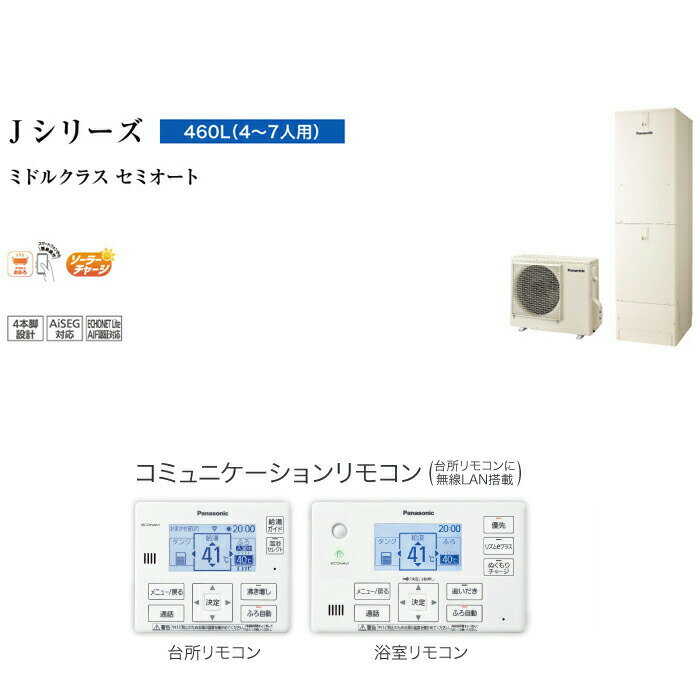 ※お客様のご都合による商品の返品・交換・キャンセルは受け付けておりません。 商品仕様をご確認の上、お間違いの無いようお願い致します。 ※型番通りのお手配になりますのでご注文前に必ず商品の仕様・サイズ・型番・色等を確認の上ご注文お願いします。 当店のお買い物ガイドも併せてご確認ください。 ◆メーカー:パナソニック ◆品名:エコキュート Jシリーズ セミオート 屋内設置用 460L 4〜7人用 給湯器+リモコン+脚部カバー ◆品番:HE-J46LSMS (HEJ46LSMS) ◆セット構成 ・本体:HE-J46LSMS ・リモコン:HE-RSWLW ・脚部カバー:AD-HEH44NA-C ◆本体カラー:アイボリー ◆エコキュート専用アプリ ◆無線LAN搭載コミュニケーションリモコン(台所リモコン) ◆ステンレス配管採用 ◆電気料金プランかんたん設定 ◆ピークセーブ機能 ◆ダブルピークカット機能 ◆ピークシフト設定 ◆ソーラーチャージ ◆キレイキープコート ◆真空断熱材 ◆4本脚 耐震設計技術 ◆ECHONET Lite AIF認証対応 ◆AiSEG2対応 ◆昼間沸き上げ停止 ◆給湯ガイド ◆自動お湯はり ◆たし湯・高温さし湯 ◆シンプル画面◆沖縄県は配送不可となります。ご了承下さい。 【メーカー直送の注意事項について】 ◆お届け先に法人・個人事業者名・屋号などを記載下さい。 ◆メーカー直送品のため、代引き決済はご利用いただけません。 ◆北海道・沖縄・離島は配送不可地域となります。 ◆土・日・祝日の配送は不可となります。 ◆必ず配達希望日のご指定をお願い致します。 ※当店10営業日以降で指定(土日祝は休みです。) 配達希望日を土日祝でご指定された場合は 最短の平日到着日に変更いたしますので、ご了承ください。 ※ご指定頂いたお日にちにお届けできない場合 (土日祝のご指定や10営業日未満でのご指定など) 当店より配達希望日変更のお願いを メールまたはお電話をさせて頂きますので、必ずご確認ください。 下記の項目は全て指定不可です。 ・時間指定 ・午前や午後等の指定 指定されても承ることができません。 ◆配達先の前面道路が4t車進入不可の場合、別途送料が必要な場合がございます。 ◆商品は、車上お渡しとなりますので、2人以上の荷受人が必要となります。 ◆現場へのお届けは不可となっております。常駐されている法人様、個人事業主様のみお届け可能です。 ◆連絡先は、日中連絡が取れる携帯番号をご記入ください。 ◆配達時不在の場合は、再配達料が必要となります。 配達日にはご在宅の上、お受け取りのご準備を宜しくお願い致します。 ◆置き配は不可となります。 ※ご注文の混み具合よりご指定の配達希望日へお届けできない場合がございます。 その際はメールにて変更後のお届け日をご連絡致しますので、 ご注文後は必ず当店からのメールをご確認ください。 ◆商品納入時に梱包の凹み、破損等がないかを 必ずご確認ください。納品時確認後の破損及びクレームは お受けできませんのでご注意ください。 ※発送予定日はメーカー在庫がある場合の納期となっております。 ※井戸水は使用できません。