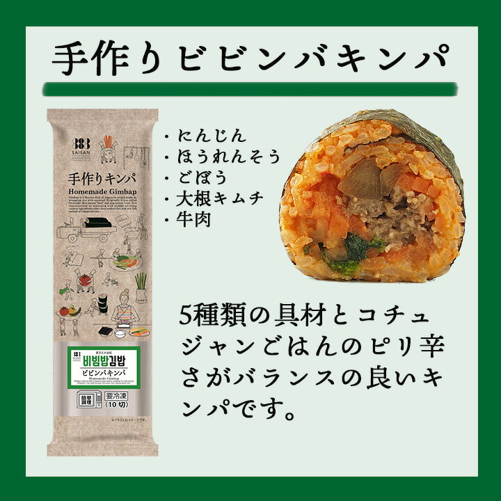 5種類の具材とコチュジャンごはんのピリ辛さがバランスの良いキンパです。 ビビンパを一口で食べられます。 <美味しいお召し上がり方> 袋を1~2cm開封し、袋ごと電子レンジ(600W3分30秒)で解凍してください。 そのまま15分間おいて、全体の温度が均一になじんでから、お召し上がりください。 ※冷たい場合は、10秒ずつ追加して加熱してください。 【商品名】冷凍ビビンパキンパ 【原材料名】野菜(人参(中国産)、ほうれんそう(中国産)、ごぼう)、うるち米(国産)、割り干し大根キムチ、コチュジャン、牛肉、食用ごま油、みりん、たれ、昆布、焼きのり、しょうゆ、植物油脂、ごま、砂糖、食塩、醸造調味料/調味料(アミノ酸等)、ソルビトール、酒精、トレハロース、酸味料、甘味料(ステビア)、着色料(パプリカ色素、パプリカ粉末、カラメル)、増粘多糖類、保存料(ソルビン酸K)、V.B1、くん液、アルコール、香料、香辛料抽出物、pH調整剤、(一部に小麦・牛肉・ごま・大豆・鶏肉・りんご・ゼラチンを含む) 【内容量】265g(1本10切) 【賞味期限】30日以上保証 【保存方法】要冷凍(-18℃以下で保存) メーカー希望小売価格はメーカーサイトに基づいて掲載しています