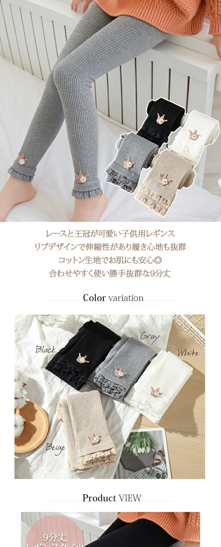 レースと王冠が可愛い子供用レギンス。 リブデザインで高い弾力性と伸縮性があり履き心地も抜群。 合わせやすく使い勝手抜群な9分丈♪ コットン生地でお肌にも安心◎ ◆素材:コットン ◆カラー:ブラック、グレー、ホワイト、ベージュ ◆サイズ:M、L、XL、XXL 【トラブル防止のため、ご注文前に必ずお読みください】 ・お客様のお使いのモニター発色によって実際の商品と色合いが異なる場合がございます。 ・税金の変動により、金額も変動することもございます。 ・下記の商品は、衛生商品のため返品交換不可です。 下着、マスク、給水パック、サポーター、インソール等。 サイズ交換の情報があっても衛生商品のため、不可となります。 rainbou【麗in房】