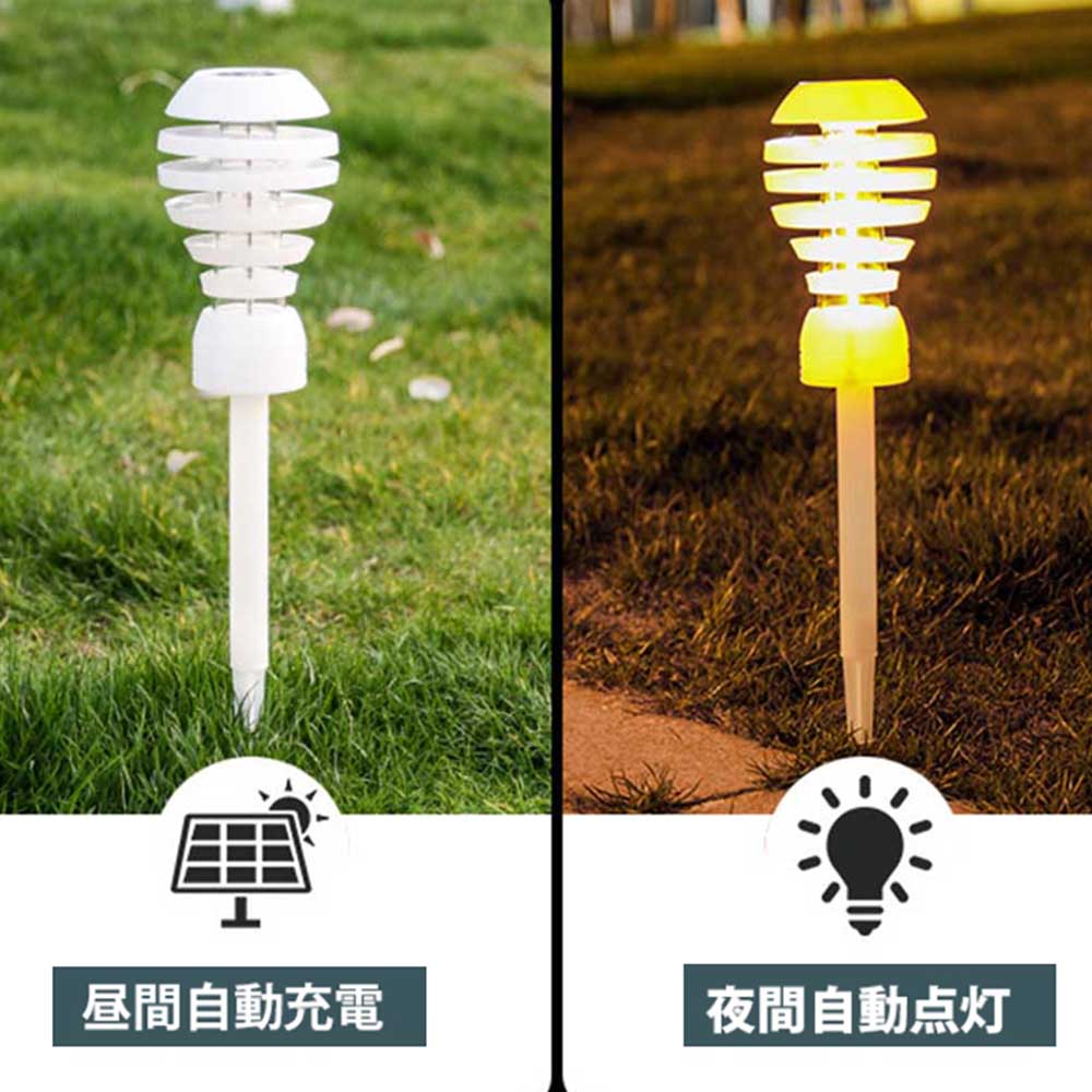 ■商品説明■ 夜の庭に彩りを与えて素晴らしい雰囲気を作ります。白光の時でも自然にお庭をライトアップします。 【電気代0円&明暗感知】ガーデンライトはソーラー充電式なので、お財布にも地球環境にも優しい。スイッチをオンにして、直射日光の良い所に置けば、日中に自動充電し、夜になると光センサーが明暗を感知で自動的に点灯で手間がかかりません。 【IP65防水規格&点灯時間】防水規格であるIP65を実施されたので、雨の日でも使用できます。昼間に直射日光にさらされて(約6−8時間)、フル充電すれば、夜に約6-8時間点灯できます。 【設置簡単&適用範囲】おしゃれなデザインに加えて追加のワイヤーは必要なく、お庭、ベランダ、花壇、芝生、玄関先、通路などに埋め込んで簡単に飾れます。置いているだけお庭を素敵にライトアップします。