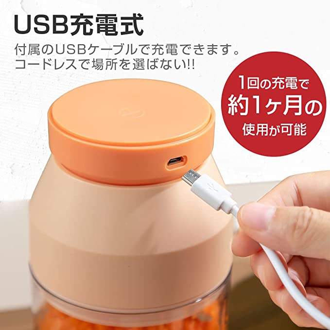 【USB充電式みじん切り器】どこでも手軽に使えるUSB充電コードレスチョッパー。電源が近くにない場所でも、サッとみじん切りをしたり、食卓で刻みたての薬味を楽しむことができます。2時間充電するだけで70回まで約1ヶ月の調理量で使えます。 【パワフル・安全設計】手前のかかる野菜のみじんや食材のかくはんが、ワンプッシュで簡単に。毎分1600回転するブレードで素早く仕上がります。過負荷防止装置を搭載しており、連続運転時間が30秒を超えると運転が止まり、長く使えるように強制的に休ませる仕組みにしています。 【収納便利・お手入れラク】出したままでも気にならないシンプルなデザインなので、手に取りやすい場所にスタンバイして置けば時短調理にも活躍。コンパクトなサイズで省スペースにも収納できるのも嬉しいポイントです。カップ、シャフト、ブレードは取り外して隅々まで水洗い可能。電源本体は乾いた布などで拭いてお手入れしてください。 【ミニチョッパーの使い方】1、ブレードをセットし、粗くカットした食材を入れます。2、隙間ができないように容器に内蓋を着け本体をセットします。3、本体とカップを両手で押さえ、プッシュボタンを押します。プッシュボタンについて、連続プッシュとパルスプッシュとの使い方がありますので、お好みの方法でご使用いただけます。 【幅広い汎用性】ゴマだけでなく、水で浸けた緑大豆・黄大豆・ピーナッツ、唐辛子、胡椒、山椒、杏仁、香辛料など様々な食材を挽けます。野菜のみじん切り、薬味作り、ドレッシングやソース、離乳食作りにも活躍。おしゃれなデザインに高い機能性、女性が大喜びする素敵なプレゼントです