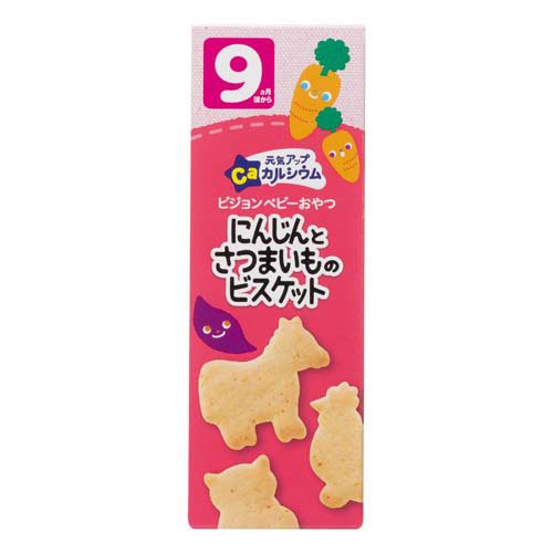 お店TOP>ベビー&キッズ>ベビーフード・離乳食>離乳食 おやつ>ベビーフード ビスケット・クッキー>ピジョン 元気アップカルシウム にんじんとさつまいものビスケット (20g*2袋)【ピジョン 元気アップカルシウム にんじんとさつまいものビスケットの商品詳細】おいしく、楽しく、発育に必要な栄養を補える、ベビーおやつです。赤ちゃんの手のひらや指先にあわせたサイズ。手づかみ食べや小さなものを指先でつまむ練習にもぴったりです。●さつまいもとにんじんの粉末を練りこんだやさしい口どけの動物形のビスケットです。●素材の風味と色を生かして自然な味わいに仕上げました。●赤ちゃんの発育に必要なカルシウムが1袋(20g)あたり29mg含まれています。●保存や携帯に便利な小袋包装です。●香料・着色料は使用していません。【品名・名称】ビスケット【ピジョン 元気アップカルシウム にんじんとさつまいものビスケットの原材料】小麦粉(国内製造)、砂糖、ショートニング、野菜粉末(さつまいも、にんじん)、コーンスターチ、フラクトオリゴ糖、食塩/膨張剤、炭酸カルシウム、レシチン(大豆由来)※本品製造ラインでは、卵・乳成分を含む製品を生産しています。【栄養成分】栄養成分表示(1袋(20g)あたり)エネルギー 84Kcalたんぱく質 1.7g脂質 1.6g炭水化物 16g食塩相当量 0.1gカルシウム 29mgこの表示値は、目安です。【アレルギー物質】小麦・大豆(厚生労働省選定28品目)※本品製造ラインでは、卵、乳成分を含む製品を生産しています。【保存方法】直射日光および高温・多湿の場所を避けて保存してください。【注意事項】・お子様がのどにつまらせないよう、おんぶしているときや横になっているときには与えないでください・うまく飲めこめないことがありますので、お子様がお召し上がりになるときには、食べ終わるまで必ずそばで見守ってあげてください・お子様が口にほおばりすぎないよう、量を調節してあげてください【原産国】日本【ブランド】元気アップカルシウム【発売元、製造元、輸入元又は販売元】ピジョンリニューアルに伴い、パッケージ・内容等予告なく変更する場合がございます。予めご了承ください。(Pigeon 元気アップCa 人参 ニンジン サツマイモ)ピジョン103-8480 東京都中央区日本橋久松町4番4号0120-741-887広告文責:楽天グループ株式会社電話:050-5577-5043[ベビーフード 10ヶ月/ブランド:元気アップカルシウム/]