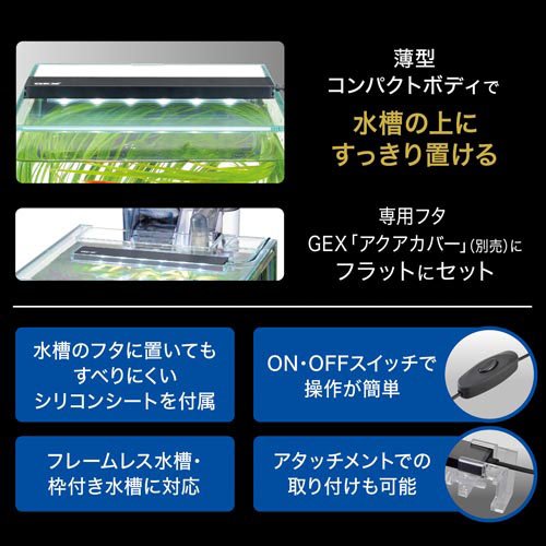 お店TOP>ペット用品>観賞魚・アクアリウム用品>アクアリウム用品>照明器具(観賞魚用)>クリアLED フラッティパワー 150BK (1個)【クリアLED フラッティパワー 150BKの商品詳細】●USB電源で電源まわりスッキリ!ハイパワーで超スリムで明るい高輝度LED!●置き方自由自在!専用フタ「アクアカバースリム300」にフラットにセット。フレームレス水槽にもすっきり置ける。●高輝度SMD LED採用!明るさ200lm、色温度6700K、演色性Ra85で、水槽を広範囲に照らします。●生体や水草の美しさを際立たせます。●上質感のあるアルミボディの洗練された外観。●薄型コンパクトボディで、水槽の上にすっきり置ける。●フレームレス水槽・枠付き水槽に対応。●多様な設置方法●水槽のフタに直接置いてもすべりにくいシリコンシートを付属。●専用フタ GEX「アクアカバー」(別売)にフラットにセット可能。●操作が簡単なON/OFFスイッチ。●本体サイズ約幅14.6×奥行2.5×厚さ0.8cm●コード長約1.5m(中間スイッチ含む)定格電圧/消費電力●DC5V 0.54A 2.7W※本製品にはUSBアダプターは付属していません!●当社純正アダプター(USBアダプター G-1A)もしくは市販のUSBアダプター(DC5V 1A以上)をお買い求めください。【使用方法】・設置する前に水槽にガラスフタ、またはプラフタを必ずセットしてください。水槽幅40cm以下の、フレームレス水槽もしくは枠付き水槽にご使用ください。・水槽にそのまま設置する場合は、LEDカバーの両端にシリコンシートを貼り、ガラスフタまたはプラフタに載せてご使用ください。・専用フタ GEX「アクアカバー」(別売)に設置する場合は、アクアカバーの凹み部分に本体をはめてご使用ください。・アタッチメントを取り付けて設置する場合は、フレームレス水槽(ガラス厚6mm以下)、枠付き水槽(枠幅17mm以下)にご使用ください【クリアLED フラッティパワー 150BKの原材料】アルミ、ABS、PC【注意事項】・本製品にはUSBアダプターは付属していません。当社純正品(GEX「USBアダプターG-1A」)もしくは市販のUSB Type-A アダプター(DC5V/1A以上)をお買い求めください。【原産国】中国【発売元、製造元、輸入元又は販売元】GEX(ジェックス)こちらの商品は、ペット用の商品です。リニューアルに伴い、パッケージ・内容等予告なく変更する場合がございます。予めご了承ください。GEX(ジェックス)大阪府東大阪市今米1-14-5072-966-0054広告文責:楽天グループ株式会社電話:050-5577-5043[アクアリウム用品]