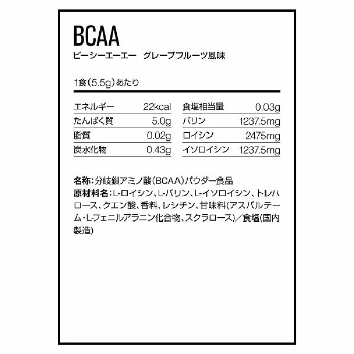 <商品説明> 最初から最後まで圧倒する。 まだ体力は残っているはずなのに思うように力を発揮できない。 まだまだ追い込めるはずなのに身体が言うことをきかない。 重要な場面で集中力が途切れてしまう。 こんな経験はないだろうか。 激しいトレーニング、張り詰めた緊張感の中での試合で誰しもが経験しているのではないだろうか。 最後まで追い込めないのも集中力が途切れてしまうのもそれは君のやる気がないからではない。 激しい運動や長時間の運動をすると血液中のトリプトファンというアミノ酸の濃度が高まり、セロトニンという物質を作り出す。 セロトニンは精神を安定させたり身体の生理機能を調節したりと重要な役割を果たしている。 しかしこれが運動中に脳の中で増え過ぎると厄介だ。集中力を低下させ、精神的な疲労を引き起こしてしまう。 そんな時、強力な味方になるのがBCAA(Branched Chain Amino Acid :分岐鎖アミノ酸)だ。 バリン、ロイシン、イソロイシンの3つの必須アミノ酸の総称のことをBCAAと呼ぶ。 BCAAとトリプトファンは脳に移行する時、同じトランスポーターを必要とする。 つまり血液中にBCAAがたくさんあると、限られたトランスポーターでは相対的に多いBCAAの脳への移行が増え、トリプトファンの移行が減るというわけだ。 勝負どころで君の強い味方になってくれること間違いないだろう。 BCAAとは Branched Chain Amino Acid :分岐鎖アミノ酸 の頭文字をとったもので、バリン、ロイシン、イソロイシンの3つの必須アミノ酸の総称。その働きはエネルギー源、身体作りは言うに及ばず、集中力にも働きかける。 BCAA以外を極力排除 無駄なものを極力排除し、1回あたりに摂取できるBCAAの量を増やした。DNSのBCAAは、まさにBCAAである。 溶けやすい 通常、水に溶けにくいBCAAだが、改良を重ね溶解性を向上。これまで飲む時にストレスを感じていた人には、ぜひ試してみてもらいたい。 美味しいグレープフルーツ風味 通常は苦味があり飲みづらいBCAA。これはこのアミノ酸唯一の弱点といえる。しかし、DNSは苦味をグレープフルーツ風味で飲みやすくしているところもポイント。 <召し上がり方> BCAAは、1回5.5gを目安に水などと一緒にお召し上がりください。 <商品情報> 製造工場:国内のGMPもしくはFSSC取得工場にて製造 賞味期限:製造日より24ヶ月 原材料をご参照の上、食物アレルギーの心配のある方はご使用をお控えください。 お子様の手の届かないところに保管してください。 開封後はなるべくお早めにお召し上がりください。 保存方法:直射日光及び高温多湿のところをさけて保存してください。 主要成分と原産国:ロイシン・バリン・イソロイシン/中国 <栄養価> 【1回(5.5g)あたり】エネルギー:22kcal、たんぱく質:5.0g、脂質:0.02g、炭水化物:0.43g、L-ロイシン:2,475.0mg、L-バリン:1,237.5mg、L-イソロイシン:1,237.5mg <原材料> L-ロイシン、L-バリン、L-イソロイシン、トレハロース、クエン酸、香料、レシチン、甘味料(アスパルテーム・L-フェニルアラニン化合物、スクラロース)/食塩(国内製造) ■当店でのご注文確定は、当店が定めるお買い物ガイド(下記含む)を理解し、同意したものとしてみなします。 ※実店舗を含め、複数の店舗と在庫を共有しており、ご注文後に在庫切れが発生する場合がございます。その際はメールにてご案内致します。事前にドメイン:shop.rakuten.co.jpをご登録ください。 ※店頭陳列在庫での販売の可能性があります。 ※メーカー画像を使用しておりますが、予告なく仕様やパッケージが変更される場合があります。 ※商品画像のカラーにつきましては、観覧される端末等の設定・環境によって実物と多少異なる場合があります。