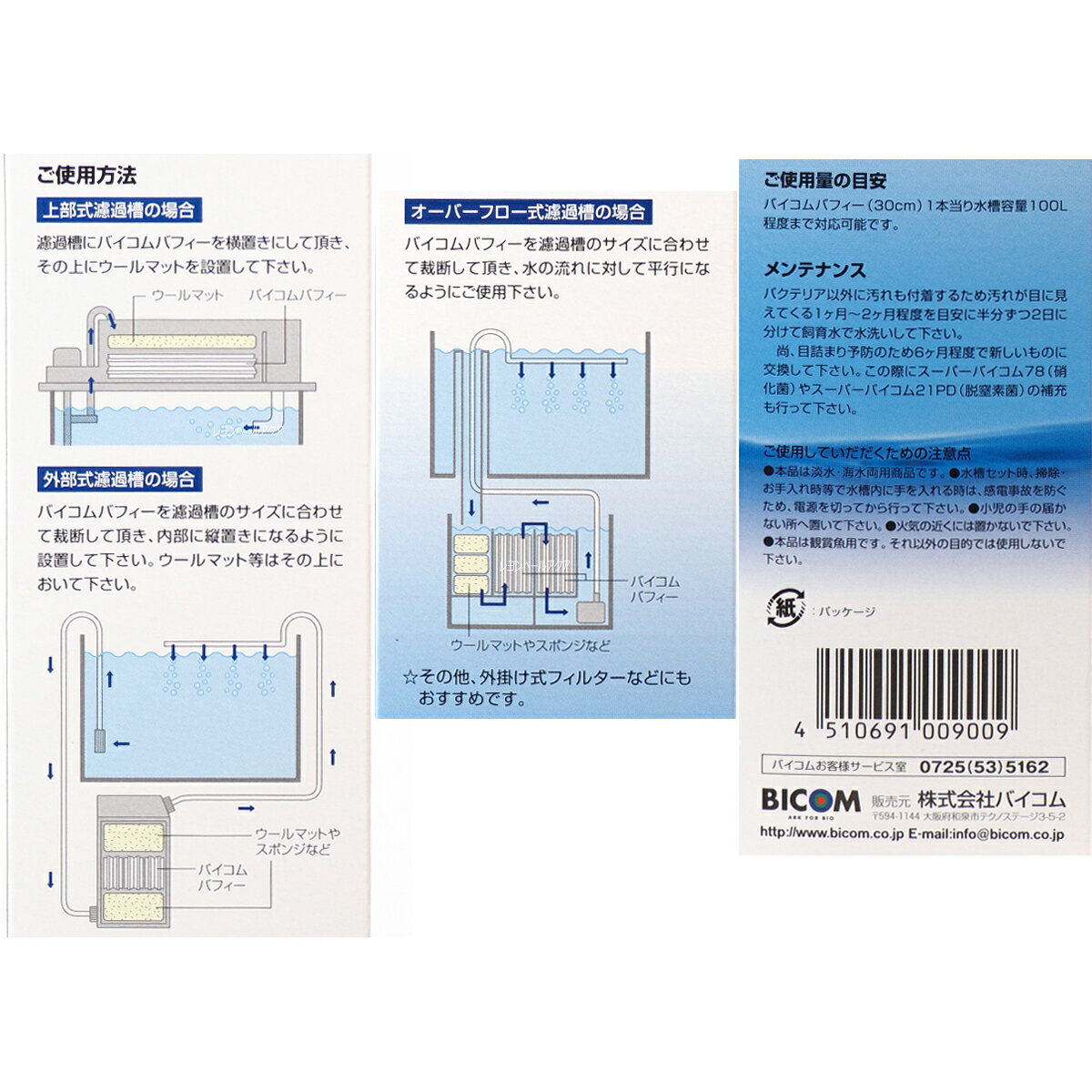 JAN: 4510691009009 「最短お届け日」でのお届け日を希望の場合、必ず「最短お届け日」を指定してください ※お届け日の指定がない注文は1-3日後の出荷となりますのでご注意ください。 ※追跡可能メール便の場合、最強翌日配送対象商品であってもお届け日を指定することはできません。 当店は39(サンキュー)ショップです 送料込みで3,980円以上送料無料 ※沖縄・離島・一部地域への配送は、9,800円(税込)以上で送料無料となります。 ■送料無料商品について 送料別の商品と一緒に注文された際も、購入金額が3980円(沖縄9800円)以上の場合は送料無料になります。 ・小型宅配便・宅配便(日本郵便) ※対面配達(受取サイン必要) ※簡易梱包にご協力お願いします。自動封函機梱包の為、大きめの箱にエアークッションで囲む梱包を基本とします。 ※複数注文の場合、複数倉庫から荷物をお届けする場合もあります。あらかじめご了承ください。 ※沖縄や離島の場合は1週間程かかる場合もあります。 ■注意事項 ・お互いにスムーズな取引の為、利用規約(会社概要)を必ずお読みください。 ・「最強配送」は日時指定必須です。必ず日時指定をしてください。指定がない場合は1-3日後の出荷となります。 ・リーズナブルな価格で販売していますが、商品はすべて新品になります。 ・キャンセルや返品は受け付けていませんので、返品商品などの再販は致しておりません。ご安心ください。 ・ 商品名にHz記載がある場合、50Hz、60Hzの間違いに気をつけてください。注文後の変更はできません。 ・注文後のお届け先住所変更や部屋番号などの記入漏れは有料で承ります。お間違い無きようご注文して下さい。 ・「不在配達通知書」が入った場合は、速やかに郵便局に連絡してください。 「不在配達通知書」の有無に関しては当社は一切関与いたしません。 ・3日以降配達されない場合は、発送通知の「お問い合わせ番号」を基に速やかに郵便局に連絡してください。再配達はお申し出がない限り行っていないようです。 ※通販取引に神経質な方、難癖付ける方、思い込みが激しい方、すぐに不安になられる方はご遠慮ください。 リーズナブルな価格でご提供するとともにスムーズな取引を心がけています。 ■商品説明● 通常のセラミックろ過材などでは、完璧にバクテリアを定着し着床させるには限界があり、 また、何ヶ月も必要でした。バイコムバフィーキューブは、空隙や空孔を利用してバクテリアを着床させる従来の方法とは異なり、磁石のように吸い付ける方法によって、今まで難しかったバクテリアの定着を可能にしました。● 定着し着床する率は、10時間で99.99%以上(当社実験結果)と高いため、スーパーバイコム78やスーパーバイコム21PD等、ろ過バクテリアを無駄にせず、水槽の立ち上げも容易になります。株式会社バイコム0725-53-5152■関連商品バイコム 78 硝化菌専用基質パック 5ml 5本セット 4510691780700バイコム カルキ抜き 250ml 淡水・海水用4510691007104バイコム コケ抑制水 アルジガード 1000ml4510691008040バイコム コケ抑制水 アルジガード 250ml4510691008019バイコム スーパーバイコム21PD海水専用脱窒菌 250ml 4510691005025バイコム スーパーバイコム21PD淡水専用 脱窒菌 250ml 4510691002024バイコム スーパーバイコム78海水専用硝化菌 500ml4510691004035バイコム スーパーバイコム78海水専用硝化菌1000ml 4510691004073バイコム スーパーバイコム78淡水専用硝化菌 500ml 4510691001034バイコム スーパーバイコム78淡水専用硝化菌1000ml (500ml×2本入り)4510691001072バイコム スーパーバイコムスターターキット 海水専用250ml (78&21&専用基質) 4510691006022バイコム スーパーバイコムスターターキット 淡水専用250ml 4510691003021バイコム バフィー30cm (菊花棒状)4510691009009バイコム バフィーボード 4510691008941バイコム メダカバイコム 硝化菌 250ml4510691007012バイコム 金魚バイコム 硝化菌 250ml4510691007005アクアリウム用品|水質調整|バクテリアバイコムバフィーでスーパーバイコムを無駄にしない!バイコム バフィー バクテリア 着床 空隙 空孔 磁石 定着 スーパーバイコム78 スーパーバイコム21PD ろ過バクテリア 水槽 立ち上げ 菊花棒状