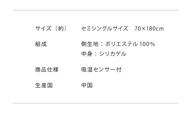 ■サイズセミシングルサイズ 70×180cm 備長炭付き■素材側生地:ポリエステル100%中身:シリカゲル■重量全体重量:約0.65kg■カラーグレー■商品仕様吸湿センサー付■生産国中国【特長】除湿シート、洗える、セミシングル、SS、70×180cm、備長炭付き、吸湿シート、センサー付き、備長炭入り、抗菌防臭、防ダニ、湿気取り、湿気とり、防カビ、梅雨、カビ対策、結露防止、除湿シート、消臭、備長炭、おねしょシーツ、天然綿、綿100%【送料について】北海道、沖縄、離島は送料を頂きます。除湿シートベビーサイズ/60×115cmハーフサイズ/90×90cmセミシングルサイズ/70×180cmシングルサイズ/90×180cmセミダブルサイズ/110×180cmダブルサイズ/130×180cmクイーンサイズ/150×180cmキングサイズ/180×180cmファミリーサイズ/220×180cm