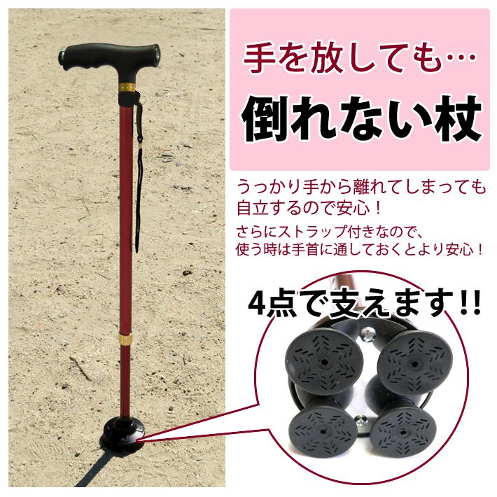 【商品特長】●軽量!手が疲れにくくて持ちやすいグリップ!●長さ調節ができる伸縮式なので、自分に合った長さにできます。LEDライト杖 軽量 4点杖 四点杖 ステッキ 伸縮杖 母の日 父の日 敬老の日 介護 プレゼント リハビリ 自立 杖 LEDライト 自立式 伸縮可能 倒れない ゴム脚 散歩 夜間 303-2Y-J0319 ワインレッド ブラック ゴールド ストラップ付【代引きについて】こちらの商品は、代引きでの出荷は受け付けておりません。【送料について】北海道、沖縄、離島は送料を頂きます。LINK底座604ブラック底座604ゴールド底座604ワインレッド