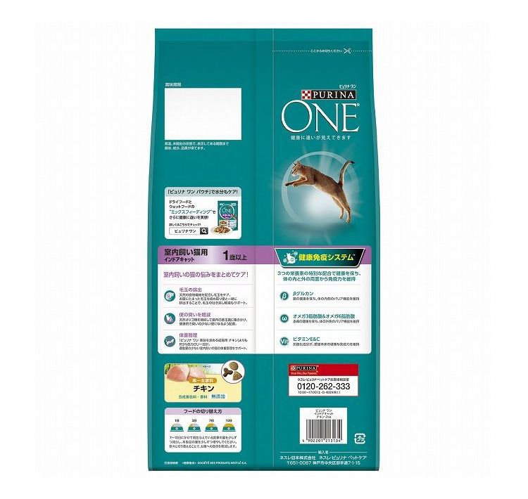 【取り寄せ品のご注意事項(ご注文前にご確認ください)】・本商品は原則注文後のキャンセルはお受けできません。・本商品と他商品で同梱注文をいただき、仮に他商品が完売等でご用意できない場合でも本商品は発送させていただきます。・本商品を複数(2点以上)注文いただき、完売等で注文数のご用意できない場合でもご用意できた数量は発送させていただきます。【商品説明】「ピュリナ ワン」は、愛猫の健康に役立つ栄養が詰まったオール・イン・ワン・フード。生涯を通じて健康寿命をサポートします。「ピュリナ ワン」は、ペットの健康に必要な【健康6要素】を満たすプレミアム・ニュートリション・フードです。1. 理想的な体格2. 抵抗力の維持3. 健康的な骨格と関節4. 消化吸収性と便5. 皮膚・被毛の健康と目の輝き6. 健康な歯ピュリナの獣医師は、ペットの健康状態が6つの要素から成り立っていると提唱しています。この【健康6要素】のすべてが満たされていることで、健康で長生きな生活に貢献します。室内飼いの猫の悩みをまとめてケア!■毛玉の排出天然の食物繊維を配合し毛玉をケア。お腹にたまった毛玉を絡め取り便と一緒に排出することで、毛玉の吐き戻し軽減もサポート。■便の臭いを軽減天然オリゴ糖を補給して腸内の善玉菌に働きかけ、健康的で臭いの少ない便になるよう配慮。■体重管理「ピュリナ ワン 美味を求める成猫用 チキン」よりも約5%低カロリー設計。運動量の少ない室内飼いの猫の体重管理をサポート。●原材料(成分)チキン、チキンミール、コーングルテン、小麦、米、脱脂大豆、食物繊維(ビートパルプ、ライスファイバー、セルロース)、鶏脂(オメガ6脂肪酸源)、小麦たんぱく、チコリ(オリゴ糖源)、大麦、たんぱく加水分解物、ツナミール(オメガ3脂肪酸源)、酵母(βグルカン源)、ミネラル類(カルシウム、リン、カリウム、ナトリウム、クロライド、マグネシウム、鉄、銅、マンガン、亜鉛、ヨウ素、セレン)、ビタミン類(A、D、E、K、B1、B2、パントテン酸、ナイアシン、B6、葉酸、ビオチン、B12、コリン、C)、カラメル色素、アミノ酸類(タウリン、メチオニン)、酸化防止剤(ミックストコフェロール)●保証成分たんぱく質34%以上、脂質12%以上、粗繊維7%以下、灰分8.5%以下、水分12%以下●賞味/使用期限(未開封)18ヶ月※仕入れ元の規定により3か月以上期限の残った商品のみ出荷致します。●保管方法別途パッケージに記載●原産国オーストラリア●メーカー名ネスレ日本 株式会社 ネスレピュリナペットケア【送料について】北海道、沖縄、離島は送料を頂きます。