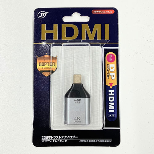PC等のminiDisplayPort端子をHDMI(タイプA)端子に変換するアダプタ特長PC等のminiDisplayPort端子をHDMI(タイプA)端子に変換するアダプタです。miniDisplayPortをHDMIに変換することで、お手軽にテレビやPCモニターに接続することができます。仕様●コネクタ形状:入力…miniDisplayPort(オス)/出力…HDMI(メス)●対応解像度:フルHD(1920×1080)/最大4K/30Hz●変換仕様:miniDisplayPort(オス)→HDMI(メス)変換※HDMIからminiDisplayPortには出力できません。●サイズ:約44×24×11mm●重量:約9g●生産国:中国●保証期間:初期不良のみメーカー名:日本トラストテクノロジー【代引きについて】こちらの商品は、代引きでの出荷は受け付けておりません。【送料について】北海道、沖縄、離島は送料を頂きます。