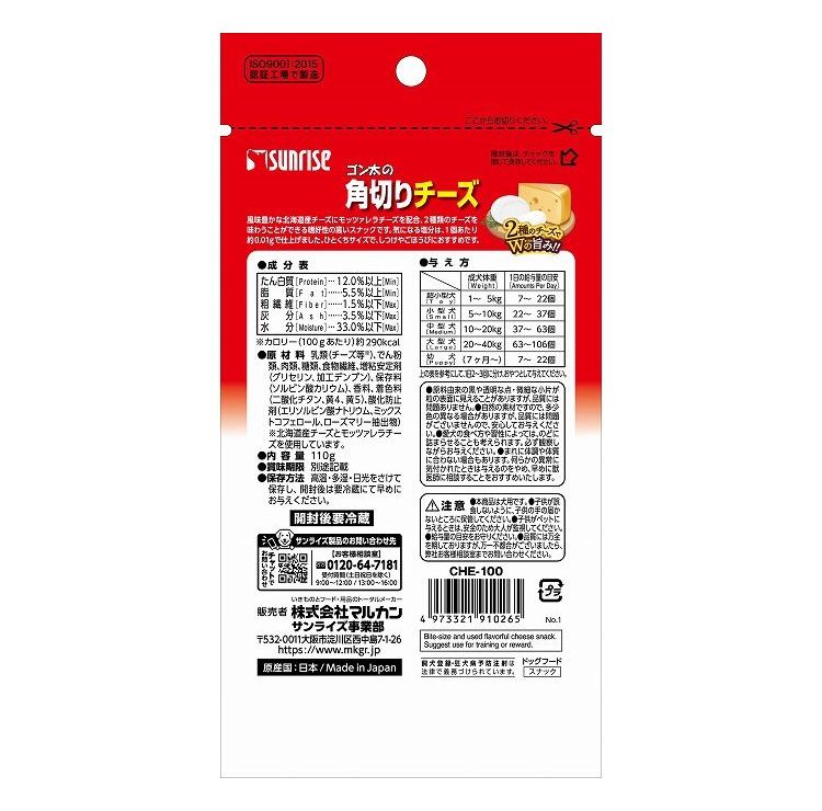 【商品説明】風味豊かな北海道産チーズにモッツァレラチーズを配合、2種類のチーズを味わうことができる嗜好性の高いスナックです。気になる塩分は、1個あたり約0.01gで仕上げました。ひとくちサイズで、しつけやごほうびにおすすめです。〇原材料(成分)乳類(チーズ等*)、でん粉類、肉類、糖類、食物繊維、増粘安定剤(グリセリン、加工デンプン)、保存料(ソルビン酸カリウム)、香料、着色料(二酸化チタン、黄4、黄5)、酸化防止剤(エリソルビン酸ナトリウム、ミックストコフェロール、ローズマリー抽出物)*北海道産チーズとモッツアレラチーズを使用しています。〇賞味/使用期限(未開封)12ヶ月※仕入れ元の規定により3か月以上期限の残った商品のみ出荷致します。〇保管方法高温・多湿・日光をさけて保存し、開封後は要冷蔵にて早めにお与えください。〇原産国日本〇メーカー名株式会社 マルカン サンライズ事業部【取り寄せ品のご注意事項(ご注文前にご確認ください)】・本商品は原則注文後のキャンセルはお受けできません。・本商品と他商品で同梱注文をいただき、仮に他商品が完売等でご用意できない場合でも本商品は発送させていただきます。・本商品を複数(2点以上)注文いただき、完売等で注文数のご用意できない場合でもご用意できた数量は発送させていただきます。【送料について】北海道、沖縄、離島は送料を頂きます。