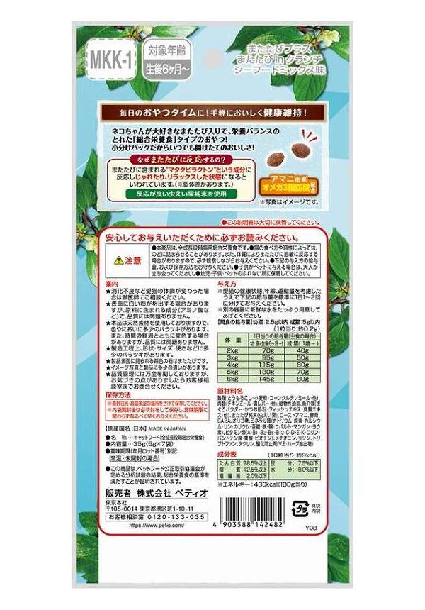 【商品説明】ネコちゃんが大好きなまたたび入りで、栄養バランスのとれた「総合栄養食」タイプのおやつ!小分けパックだからいつでも開けたてのおいしさ!ネコちゃんの大好きなシーフードミックス味。○原材料穀類(とうもろこし・小麦粉・コーングルテンミール・他)、肉類(チキンミール・鶏レバー・他)、動物性油脂、魚介類(まぐろパウダー・かつお節粉・フィッシュエキス・真鯛エキス・他)、またたび純末(虫えい果)、ローストアマニ、酵母、GABA、オリゴ糖、ミネラル類(ナトリウム・塩素・カルシウム・リン・カリウム・亜鉛・鉄・銅・コバルト・マンガン・ヨウ素)、ビタミン類(A・B1・B2・B6・B12・C・D・E・K・コリン・パントテン酸・葉酸・ビオチン)、メチオニン、リジン、トリプトファン、タウリン、酸化防止剤( V. E・ハーブ抽出物)○賞味/使用期限(未開封)547日※仕入れ元の規定により3ヶ月以上期限の残った商品のみ出荷致します○保管方法※直射日光・高温多湿の場所をさけて保存してください。※内袋開封後は必ず封をして保存し、賞味期限に関わらずなるべく早くお与えください。○原産国日本○メーカー名株式会社 ペティオ【取り寄せ品のご注意事項(ご注文前にご確認ください)】・本商品は原則注文後のキャンセルはお受けできません。・本商品と他商品で同梱注文をいただき、仮に他商品が完売等でご用意できない場合でも本商品は発送させていただきます。・本商品を複数(2点以上)注文いただき、完売等で注文数のご用意できない場合でもご用意できた数量は発送させていただきます。【送料について】北海道、沖縄、離島は送料を頂きます。