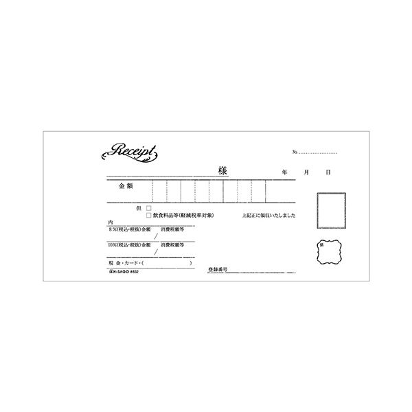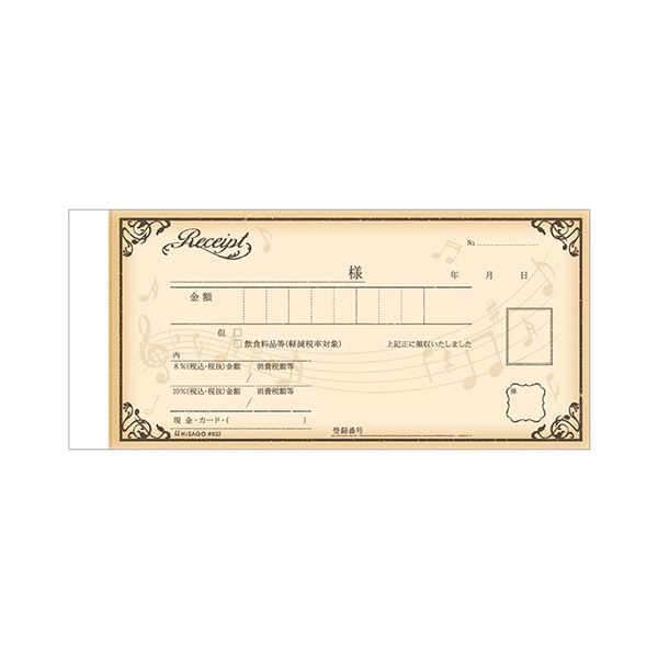 ■商品内容使い勝手のよい2枚複写の小切手サイズ。●アンティークなイメージの音符をデザインした領収証です。40組、5冊セットです。●楽器店や、バー、カフェなどアンティークなイメージのお店におすすめです。●ノーカーボン紙を使用しているので手が汚れません。●クリアカットミシンできれいに切り離せます。●便利な折り込み下敷き付き。●インボイス制度に対応しています。税率ごとに金額を記入できます。■商品スペックサイズ:小切手寸法:タテ85×ヨコ185mm伝票タイプ:複写式複写枚数:2枚カーボン:ノーカーボン消費税欄:あり色:ブラウンその他仕様:●デザイン:音符●ミシン目切り離し後の寸法:タテ85×ヨコ170mm●複写内訳:[1枚目]領収証、[2枚目]領収証(地紋・厚紙を使用)■送料・配送についての注意事項●本商品の出荷目安は【5 - 11営業日 ※土日・祝除く】となります。●お取り寄せ商品のため、稀にご注文入れ違い等により欠品・遅延となる場合がございます。●本商品は仕入元より配送となるため、沖縄・離島への配送はできません。