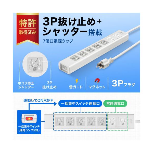 サンワサプライ 抜け止めシャッタータップ 3P抜け止め7個口 (5個口連動集中スイッチ) 3m ホワイト TAP-F37SH-3K