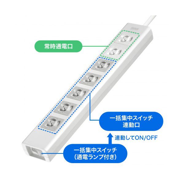 ■商品内容●集中スイッチで5個口をオン/オフすることができます。2個口は常時通電口(差込口が白色)となっており、常に通電している機器の接続に便利です。●差込口は、3P抜け止めシャッター仕様の7個口タップです。●スチールデスクなどに仮固定できるマグネット付きです。●通電状態が一目で確認できる、ランプ付き集中スイッチを採用しています。●雷サージ吸収素子内蔵で雷から機器をガードできます。●環境に優しい簡易ビニール(PE素材)包装を採用しています。■商品スペック■定格容量 : 15A・125V■PSE適合規格 : あり■差し込み口形状 : 3P■プラグ形状 : 3P■プラグ仕様 : 平行型■絶縁キャップ : なし■差込口タイプ : 抜け止めタイプ■差込口間隔 : 35mm■差込口カラー : グレー■差込口数 : 7個口■シャッター : あり■雷ガード : あり■マグネット : あり■電源コード長 : 3m■アース端子 : なし■一括スイッチ連動口 : 5個口■常時通電口 : 2個口■制限電圧 : 775V■サージ耐量 : 2500A(1回)、2000A(2回)2500A(1回)、2000A(2回)■バリスタ電圧 : 470V■スイッチ : 一括集中スイッチ■使用地域 : 日本国内のみ。日本以外ではご使用いただけません。■送料・配送についての注意事項●本商品の出荷目安は【4 - 7営業日 ※土日・祝除く】となります。●お取り寄せ商品のため、稀にご注文入れ違い等により欠品・遅延となる場合がございます。●本商品は仕入元より配送となるため、沖縄・離島への配送はできません。[ TAP-F37SH-3K ]