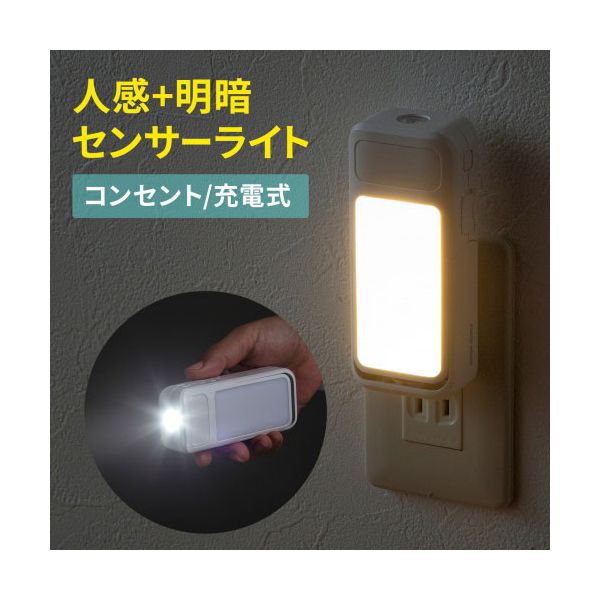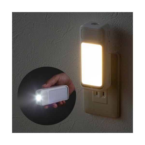 ■商品内容●人感明暗センサー搭載で、周囲が暗くて人を感知すると自動的に前面LEDが点灯します。●側面のセンサー切替スイッチをOFFにすることで、常時点灯ライトとして使用もできます。●停電時には自動で先端LEDが点灯します。●コンセントから取り外した時にも、自動で先端LEDが光り、懐中電灯としても使用できます。●バッテリー搭載モデルで、電源のない場所でも作業灯としても使用できます。●マグネット内蔵で、スチール面への固定にも対応しています。■商品スペック■色温度 : 前面LED : 2700K(電球色)先端LED : 6500K(昼光色)■本体サイズ : 約116×50×31mm■光束 : 約70ルーメン※先端LEDの場合前面LED : 約20ルーメン先端LED : 約70ルーメン■調光 : 3段階※前面LEDのみ前面LED : 約5ルーメン、約10ルーメン、約20ルーメン■LED数 : 11粒■消費電力 : 約1.5W■電源 : リン酸鉄リチウムイオン充電バッテリー■連続使用時間 : 約16時間前面LEDの場合 : 16時間先端LEDの場合 : 5時間■バッテリー容量 : 500mA■充電時間 : 約4時間■センサー距離 : 約3m感知範囲1mの場合 : 120度2mの場合 : 100度3mの場合 : 80度■LED寿命 : 25000時間■使用温度範囲 : 約-10℃〜-40℃■送料・配送についての注意事項●本商品の出荷目安は【4 - 7営業日 ※土日・祝除く】となります。●お取り寄せ商品のため、稀にご注文入れ違い等により欠品・遅延となる場合がございます。●本商品は仕入元より配送となるため、沖縄・離島への配送はできません。[ LED-SL1 ]