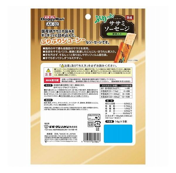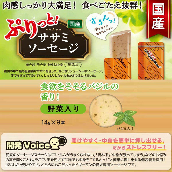 【取り寄せ品のご注意事項(ご注文前にご確認ください)】・本商品は原則注文後のキャンセルはお受けできません。・本商品と他商品で同梱注文をいただき、仮に他商品が完売等でご用意できない場合でも本商品は発送させていただきます。・本商品を複数(2点以上)注文いただき、完売等で注文数のご用意できない場合でもご用意できた数量は発送させていただきます。【商品説明】肉感のある食べごたえに大満足!国産鶏ササミの旨みをギュギュッと詰め込んだ、ぷりぷりジューシーなソーセージです。・鶏肉の中で最も低脂肪のササミを使用。・食欲をそそるバジル、健康に配慮したにんじん、ほうれん草入り。・手を汚さず、するんっ!と取り出しやすいフィルム個包装。・手でちぎって少しずつ与えやすい。・着色料、発色剤、酸化防止剤 無添加●原材料(成分)鶏肉(胸肉、ササミ、チキンエキス)、コーンスターチ、調味料、野菜類(にんじん、ほうれん草)、バジル、増粘多糖類、ビタミンE●賞味/使用期限(未開封)24ヶ月※仕入れ元の規定により半年以上期限の残った商品のみ出荷致します●保存方法別途パッケージに記載●原産国または製造地日本●メーカー名ドギーマンハヤシ 株式会社【送料について】北海道、沖縄、離島は送料を頂きます。