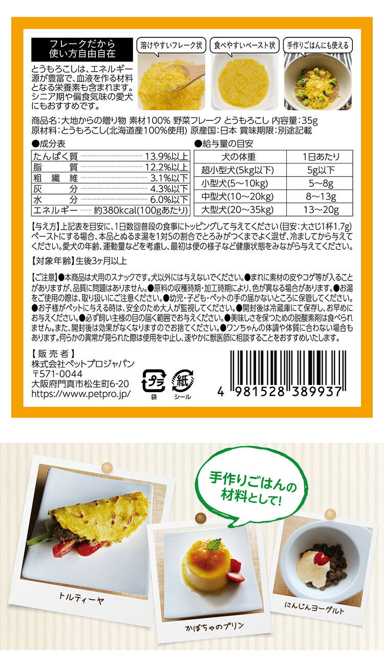 【12個セット】 ペットプロ HappyDays 大地からの贈り物 素材100%野菜フレーク とうもろこし 35g 国産 日本製 犬用 犬 おやつ スナック ふりかけ トッピング【送料無料】
