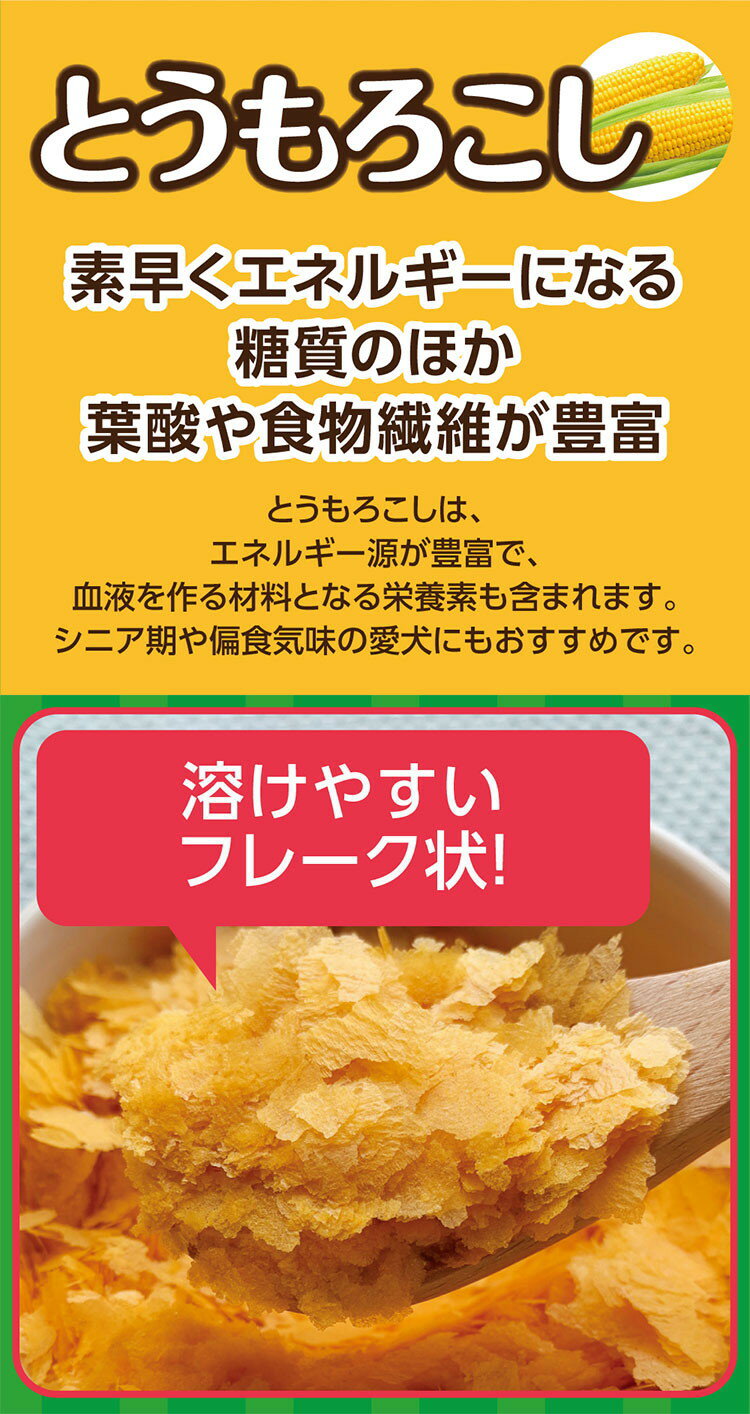 【取り寄せ品のご注意事項(ご注文前にご確認ください)】・本商品は原則注文後のキャンセルはお受けできません。・本商品と他商品で同梱注文をいただき、仮に他商品が完売等でご用意できない場合でも本商品は発送させていただきます。・本商品を複数(2点以上)注文いただき、完売等で注文数のご用意できない場合でもご用意できた数量は発送させていただきます。【商品説明】北海道産とうもろこしを使用、素材の栄養そのままのフレーク。安心安全な国産(北海道産)100%のとうもろこしを素材のうまみと栄養そのままフレークにしました。とうもろこしは素早くエネルギーになる糖質のほか、葉酸や食物繊維も豊富。シニア期や偏食ぎみの愛犬にもおすすめです。ふりかけとしていつものごはんにトッピングして、食べやすいペースト状にして、手作りごはんに、おやつになど使い方自由自在。●原材料とうもろこし●保証成分たんぱく質13.9%以上、脂質12.2%以上、粗繊維3.1%以下、灰分4.3%以下、水分6.0%以下●給与方法一日あたりの給与量の目安:超小型犬(5kg以下)5g以下、小型犬(5〜10kg)5〜8g、中型犬(10〜20kg)8〜13g、大型犬(20〜35kg)13〜20g与え方:一日数回普段の食事にトッピングして与えてください(目安:大さじ1杯1.7g)。ペーストにする場合、本品とぬるま湯を1対5の割合でとろみがつくまでよく混ぜ、冷ましてから与えてください。愛犬の年齢、運動量などを考慮し、最初は便の様子など健康状態をみながら与えてください。●賞味/使用期限(未開封)18ヶ月※仕入れ元の規定により3ヵ月以上期限の残った商品のみ出荷致します。●原産国または製造地日本●保存方法開封後は冷蔵庫にて保存し、お早めにお与えください。●諸注意対象年齢:生後3ヶ月以上。本品は犬用のスナックです。犬以外には与えないでください。まれに素材の皮やコゲが入ることがありますが、品質に問題はありません。原料の収穫時期・加工時期により、色が異なる場合があります。お湯をご使用の際は、取り扱いにご注意ください。お子様の手の届かないところに保管してください。お子様がペットに与える際は、安全のため大人が監視してください。給与量の目安、および保存方法をお守りください。ワンちゃんの体調や体質に合わない場合もあります。何らかの異常が見られた際は使用を中止し、速やかに獣医師に相談することをおすすめいたします。【送料について】北海道、沖縄、離島は送料を頂きます。素材100%野菜フレーク とうもろこし4個セット8個セット12個セット